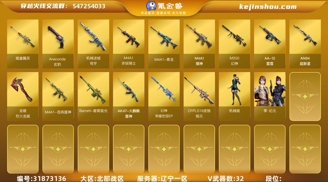 MCF808【32V 幻神三件套 M200-幻神 幻神荣耀世冠EP皮肤 幻神竞星跃动音效卡】【等级】81【区服】辽宁一区【段位】荣耀之巅【英雄角色】1【英雄武器】32【炫金级武器】炫金毁灭【英雄级角色】机械姬 【英雄级武器】烟雾弹-荣耀世冠EP HK417-朱雀-电竞之星 屠龙-电竞之星 M4A1-苍鸣雷神 QBZ03-独角-I Barrett-碧霄极光 烟雾弹-玄豹 闪光弹-玄豹 Anaconda-玄豹 高爆手雷-玄豹 高爆手雷-玄豹 闪光弹-玄豹 丛林匕首-玄豹 高爆手雷-玄豹 烟雾弹-玄豹 闪光弹-玄豹 烟雾弹-玄豹 机械迷城-穹宇 AA-12-雷霆 M4A1-猎神 闪光弹-竞技荣光 闪光弹-竞技荣光 高爆手雷-竞技荣光 烟雾弹-竞技荣光 AN94-超新星 高爆手雷-幻灵 烟雾弹-幻灵 闪光弹-幻灵 M4A1-青龙 M200-幻神 龙啸-烈火龙威 无影-神兵利器 【源级武器】魂·裁决-胜者为王 魂·毁灭-墨兰 魂·裁决-凤灵 魂·Barrett-朱雀-锦鲤 灵·HK417-朱雀-甜蜜火力 魂·裁决-神秘按键 魂·天神-维纳斯 魂·毁灭-秦师 魂·雷神-神秘按键 灵·Barrett-朱雀-炫光 火麒麟-零·纪元 魂·修罗-迷彩 火麒麟-雷神 魂·炼狱- 迷彩 加特林-炼狱-掌火 火麒麟-零·纪元 源·玫瑰精灵 源·毁灭 源·雷神 源-雷神 IV M4A1-青龙-掌上穿越火线 魂·英雄-湾区光枢 灵·麒麟刺-穹宇 灵·天神-穹宇 魂·屠龙-惊鸿 源-金色蔷薇 魂·黑骑士-破浪10年 魂·M4A1-雷神-化蛇 魂·毁灭-墨兰 魂·屠龙-春桃 魂·雷神-新春神龙 魂·HK417-朱雀-凤灵 源·火麒麟 魂·裁决-凤灵 源·机械迷城 魂·黑骑士-幻能朋克 源·毁灭 源·Barrett-朱雀 魂·擎天-破浪10年 魂·黑骑士-破浪10年 魂·毁灭-航天科技 AWM-裁决-百城联赛天津 魂-麒麟刺-萌杀 魂·雷神-维纳斯 源·青龙 魂·麒麟刺-月 魂·炼狱-月 源·天神 源·屠龙 源·龙啸 源·天启 源·黑骑士 源-极光 魂·雷神-15周年嘉年华 魂·修罗