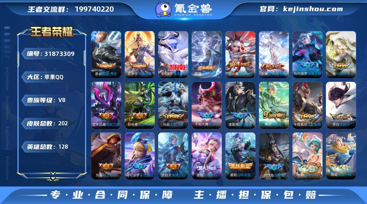 【金标马可波罗】贵族等级: V8 英雄数: 128 皮肤数: 202 荣耀水晶: 鸣剑·曳影,九霄神辉 珍品传说: 怪盗基德,器灵·落星盏 传说皮: 久胜战神,炽阳神光,末日机甲-孙尚香,海洋之心,地狱之眼,时之恋人-刘备,无双飞将,鹤羽星尊,妄想实况 限定皮: 祈雪灵祝,御风骁将,孙行者,深海之息,绯月行,诗剑行,山海·玄木吟,无限倾心-虞姬,鸣野蒿,愿照·千秋盛