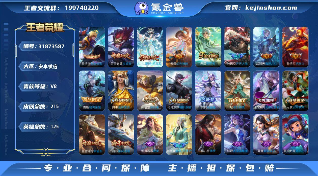 FJ7639 安卓微信 V8 215皮 2典藏 64限定8传说 打野30段 对抗路/游走23段 4按键 694英雄碎片 146蔷薇之心 1988星币 营地号:1852679019 【荣耀典藏】全息碎影,武则天, 【热门限定】愿照·众生和,器灵·浮梦炉,白虎志,朱雀志,御风骁将,奔雷神使,天狼绘梦者,时之奇旅,暗影游猎,时之奇旅,齐天大圣,启明星使, 【限定传说】拒霜思,电玩小子,孙行者,蓝屏警告,地狱火,苍穹之光,时之恋人女,修罗,神迹守卫,黄金分割率,晚萤,海洋之心,千年之狐,遇见神鹿,无限星赏官,原初探秘者,原初追逐者,黎明之约,暗隐猎兽者,水晶猎龙者,金属风暴,地狱岩魂,曙光守护者,幻光神枪,圣诞恋歌,逐浪之夏,紫霞仙子,功夫厨神,幽灵船长,节奏热浪,天才门将,暗夜贵公子,偶像歌手,街头霸王,缤纷独角兽,星空之诺,鬼剑武藏,德古拉伯爵,银河之约,云间偶戏,冰冠公主,狂想玩偶喵,单词大作战,花好人间,饕餮,烛龙,重明,穷奇,御狮,御旌,御銮,朔风刀,混沌棋,疑决卦,醍醐杖,万华元夜,东方不败,拳王,丁香结,科学大爆炸,