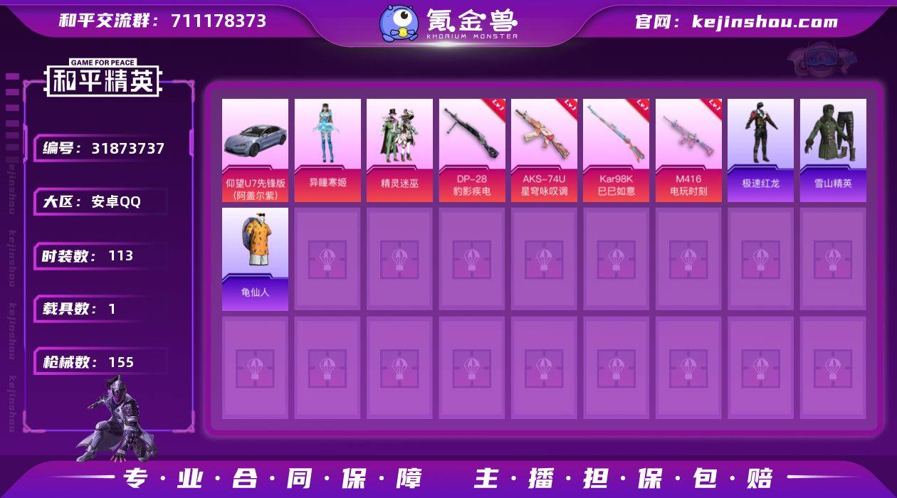 M1045755【特价推荐1载具2粉装4特效】安卓Q-1载具2粉装4特效枪4热门113套装155枪皮 47292热力值 12印记 历史超级王牌9星 【1载具】 仰望U7先锋版(阿盖尔紫) 【2粉装】 异瞳寒姬 精灵迷巫 【4特效枪】 M416-电玩时刻 (5级) AKS-74U-星穹咏叹调 (7级) Kar98K-巳巳如意 (5级) DP-28-豹影疾电 (5级) 【4热门】 龟仙人 雪山精英 极速红龙 M762-奇异狩猎者 【1头盔】 夏日绵绵冰头盔 营地ID:904394818