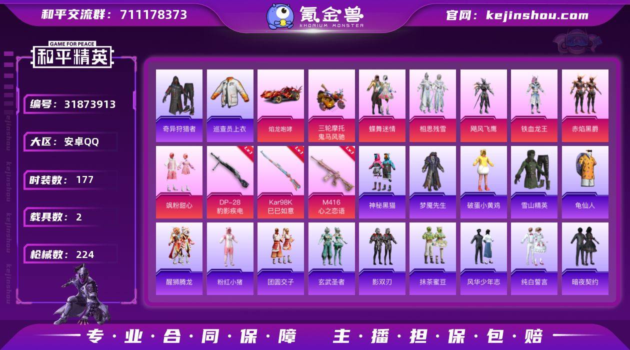 【ky657】安卓 手Q-11粉装-3特效枪-3载具-0粉色飞行器-77724热力值-10王牌印记-183套装-246枪皮 【热门品类】:套装-龟仙人,套装-浪漫波比,套装-粉红小猪,套装-糯粉咩咩 【粉色套装】:粉装-天使彩虹糖,粉装-筑梦精灵,角色-白勺歌姬,角色-呆萌星弥,角色-小可学妹,角色-圣堂之誓,角色-小叽联名款,角色-电波星,粉装-金丰海韵,角色-千金淑猫,角色-樱桃泡泡 【粉色枪皮等级】:Kar98K-巳巳如意(五级),AWM-天使羽翼(七级),DP-28-豹影疾电(五级) 【粉色载具】:阿斯顿马丁DBS(绿),路特斯EVIJA(星际黄),海龙奔腾 【粉色枪皮】:Kar98K-巳巳如意,AWM-天使羽翼,DP-28-豹影疾电 【粉色降落伞】:甜心宝贝降落伞,神秘黑猫降落伞,阿狸红降落伞,银刃赛罗降落伞,炙焰牛王降落伞,垂柳戏鸭降落伞,白勺歌姬降落伞,小叽联名款降落伞,猪猪侠降落伞,江南烟雨降落伞,千金淑猫降落伞,樱桃泡泡降落伞,幻彩电音降落伞,炫彩糖果降落伞 【稀有套装】:套装-龟仙人,套装-巳巳如意,套装-雪国风尚,套装-雏菊兔兔,套装-萝兰蝴蝶,套装-小熊娃娃,套装-糖糖葫芦,套装-青团波波,套装-棉花软糖,角色-都市丽猫,角色-摩登魅猫,套装-燕燕于飞,套装-鱼渊荷华,角色-糖霜甜心,角色-蜜桃派对,套装-极速光影,套装-彩虹兔,套装-云朵鹅,套装-雪绒豹,套装-蜜露汐语,角色-夜瞳黯灵,套装-朱霞炽焰,套装-凌霄紫焰 【稀有枪皮】:AKM-冰凉西瓜,AKM-彩虹符号,AKM-灼热熔岩,AKM-玉龙,AKM-破晓战魂,AKM-霓虹街区,AKM-龙的传人,M16A4-天使羽翼,M16A4-幻世战舞者,M16A4-甜心亚梦,M16A4-红色方程式,M16A4-蓝色火焰,M16A4-千金淑猫,SCAR-L-炫彩节奏,SCAR-L-玉兔迎春,SCAR-L-红色方程式,M416-夜灯,M416-潮汐统领,M416-神秘黑猫,M416-糯团青竹,M416-红色方程式,M416-蓝色火焰,GROZA-彩虹符号...