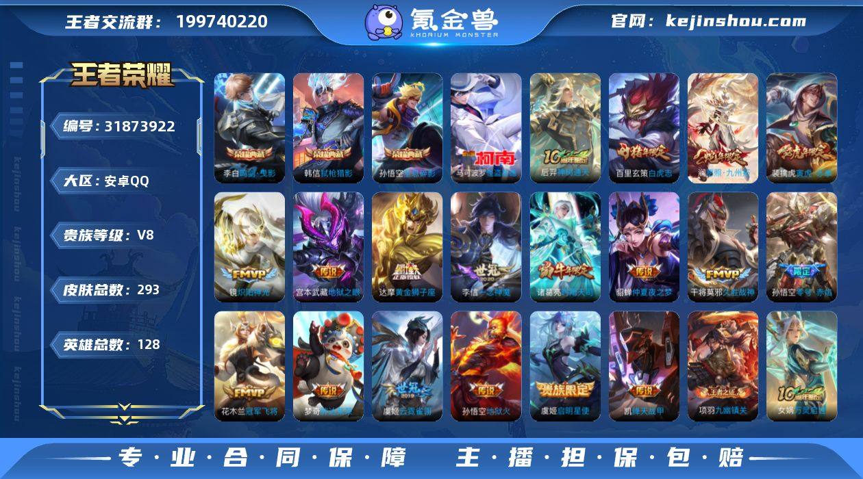【王者荣耀】珍品无双0 典藏3 无双0 珍品传说1 传说21 史诗95 英雄128 皮肤293 贵族8级 荣耀典藏:全息碎影|鸣剑·曳影|弑枪猎影__珍品传说:怪盗基德__传说皮肤:绛天战甲|炽阳神光|启明星使|胖达荣荣|地狱之眼|地狱火|仲夏夜之梦|云霓雀翎|久胜战神|黄金狮子座|狄仁杰-超时空战士|刘备-时之恋人|一念神魔|冠军飞将|白虎志|兰陵王-默契交锋|零号·赤焰|时雨天司|寅虎·赤拳|愿照·九州拓|神树通天__稀有限定:寅虎·御盾|寅虎·展翼|寅虎·心曲|奔雷神使|御风骁将|白晶晶|至尊宝|朱雀志|大圣娶亲|一生所爱|神威|烈魂|龙胆|傲雪梅枪|李小龙|梁祝|狮舞东方|拒霜思|暗影游猎|白昼王子|百解令|大漠名商|地狱燃心|繁星吟游|古海寻踪|海滩派对|海盐诗旅|幻夜卜梦|皇家上将|混沌棋|火炮绅士|剑破天穹|金庭之子|凯尔特女王|狂想玩偶喵|黎明之约|炼金王|迷踪丽影|魔术师|花木兰-默契交锋|千军破阵|擒涛扼浪|穷奇|荣光圣徽|沙漠行僧|朔风刀|探海日志|饕餮|醍醐杖|天穹祈灯|玩趣恶龙|万华元夜|妄想食味|无心|纤云弄巧|演武夺筹|疑决卦|阴阳师|游园惊梦|御旌|御銮|御狮|原初追逐者|云间偶戏|暗夜猫娘|暗隐猎兽者|白龙吟|缤纷独角兽|冰冠公主|冰雪圆舞曲|苍穹之光|乘风破浪|大乔-猫狗日记|德古拉伯爵|地狱岩魂|电玩小子|功夫厨神|鬼剑武藏|黄金分割率|箭羽风息|金属风暴|魅力维加斯|魅语|梦奇-顽趣|偶像歌手|奇遇舞章|赏金猎手|圣诞狂欢|诗语江南|水果甜心|水晶猎龙者|孙策-猫狗日记|天才门将|天秀·启明|晚萤|星夜王子|摇滚巨星|鹰眼统帅|永昼|幽灵船长|月团寄思|逐浪之夏|紫霞仙子|百里守约-百相守梦|老夫子-百相守梦|谪仙醉月|噬灭天穹|敬我三分|天穹之誓|修罗|曙光守护者|心灵战警|千年之狐|孙尚香-时之恋人|无限星赏官|舞动绿茵|特工魅影|心灵骇客|星界战将|御霄|狰|烛龙|原初探秘者|重明|云中旅人|单词大作战|钟馗-神迹守卫|流音漫舞...