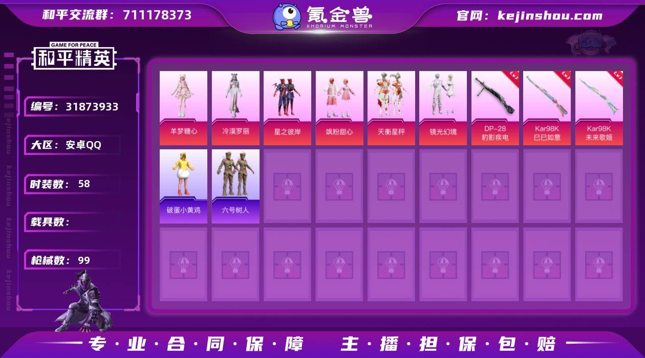M1045759【6粉装3特效枪特价出售 素材号】安卓Q-6粉装3特效枪2热门58套装99枪皮 30946热力值 1印记 历史超级王牌10星 【6粉装】 冷漠罗丽 羊梦糖心 飒粉甜心 镜光幻境 天衡星秤 星之彼岸 【3特效枪】 Kar98K-巳巳如意 (5级) DP-28-豹影疾电 (5级) Kar98K-未来歌姬 (7级) 【2热门】 六号树人 破蛋小黄鸡 【2背包】 甜心宝贝背包 金属狂野背包 营地ID:959823775