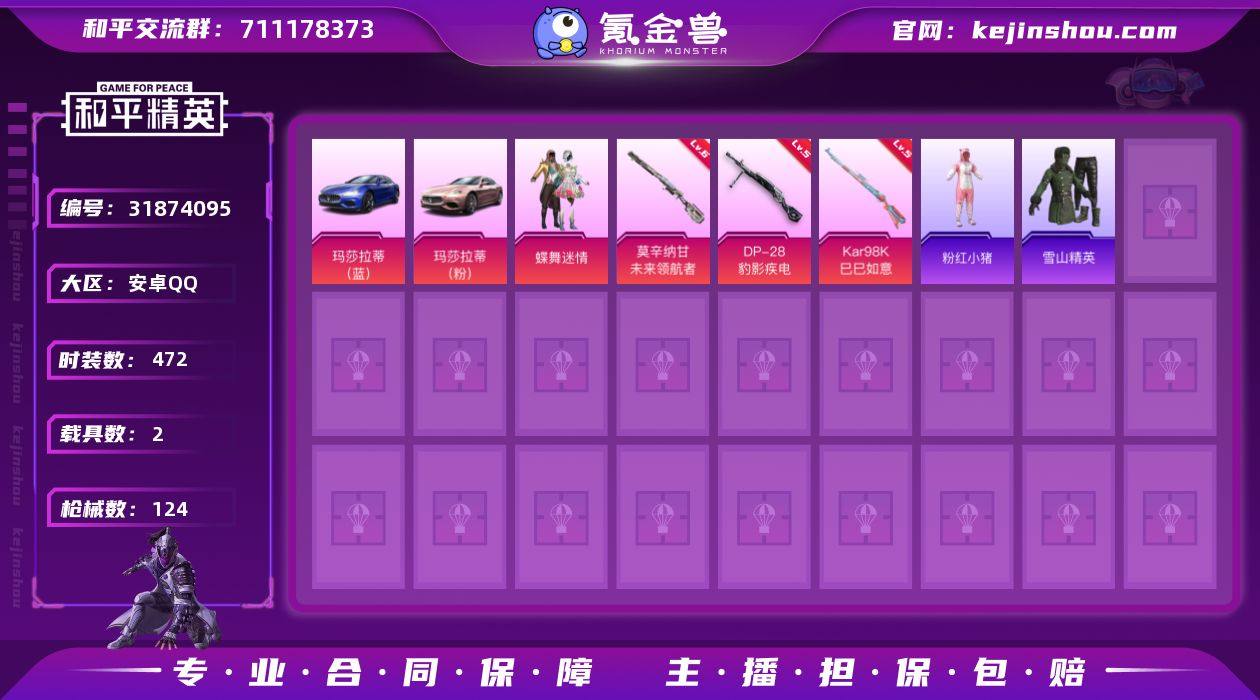 60102|精品脱坑和平号 安卓QQ 1粉装 (蝶舞迷情) 3粉枪(莫辛纳甘-未来 Kar98K-巳已如意 DP-28-豹影疾电) 2车 (玛莎拉蒂Ghibli( 玛莎拉蒂Ghibli(...)安卓QQ 历史总热力值:36687 粉装数量:1 特效枪数量:3 载具数量:2 王牌印记:3 历史最高段位:卓越王牌5星 套装数量:111 时装数量:472 枪械数量:124 战备数量:86 装备数量:138 载具:玛莎拉蒂Ghibli(粉),玛莎拉蒂Ghibli(蓝) 时装:套装-蝶舞迷情,套装-SS14特训,套装-SS19特训,套装-SS20特训,套装-SS21特训,套装-SS22特训,套装-SS23特训,套装-SS25特训,套装-SS26特训,套装-SS27特训,套装-SS28特训,套装-SS29特训,套装-SS30特训,套装-SS31特训,套装-SS32特训,套装-SS33特训,套装-SS34特训,套装-SS35特训,套装-SS36特训,套装-SS37特训,套装-SS6特训,套装-SS7特训,套装-SS8特训,套装-SS9特训,套装-人气偶像,套装-传奇侦探,套装-元气之梦,套装-元素星魂,套装-冰河战士,套装-北国孤狼,套装-吉莉礼服,套装-夏日音浪,套装-大橘大利,套装-完美偶像,套装-巳巳如意,套装-幻世战舞者,套装-幻影武者,套装-战地督导,套装-战术大师,套装-探宝勇士,套装-星途旅人,套装-智慧之神,套装-智谋强哥,套装-曼妙人鱼,套装-森林游猎者,套装-活力之心,套装-海上生明月,套装-海岛探路者,套装-海盐绵绵冰,套装-深蓝色名流,套装-湖蓝色名流,套装-漫游都市,套装-潮流炫酷,套装-灼焰舞者,套装-热情海星,套装-牛气冲天,套装-牛气满满,套装-特战装甲,套装-特殊使命,套装-特训学院,套装-狙击之神,套装-猎鹰,套装-猛禽,套装-甜蜜告白,套装-白糯汤圆,套装-白色伏地魔,套装-破晓战魂,套装-破蛋小黄鸡,套装-空岛之星,套装-竞技勇士朋克,套装-竞技名士,套装-竞技达人朋克,套装-粉红小猪,套装-红色运动,套装-纯真浪花,套装-绮丽涂鸦,套装-缤纷果语,套装-翡翠奔狼,套装-耀粉歌者,套装-老实芭蕉,套装-萌鸡速...