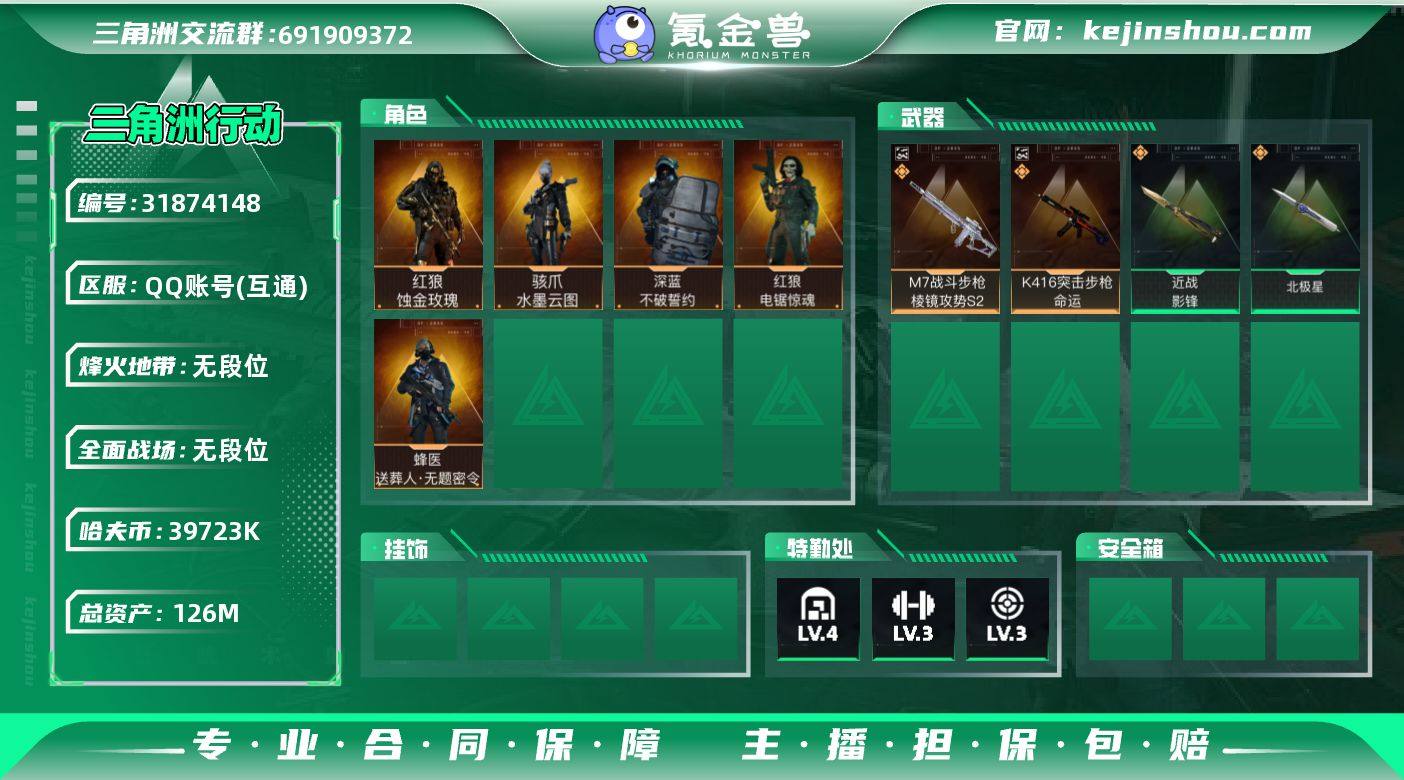 LJ5512总资产126.4M哈弗币39723K近战武器-北极星,近战武器-影锋红狼蚀金玫瑰,骇爪水墨云图,蜂医送葬人无题密令,深蓝不破誓约,红狼电锯惊魂M7战斗步枪-棱镜攻势S2(极品A),K416突击步枪-命运(极品A)无AW子弹17发三角币379仓库LV.7基础安全箱靶场LV.6训练中心LV.7无,红狼-蚀金玫瑰,骇爪-水墨云图,蜂医-送葬人·无题密令,深蓝-不破誓约,红狼-电锯惊魂,近战-北极星,近战-影锋,M7战斗步枪-棱镜攻势S2,K416突击步枪-命运