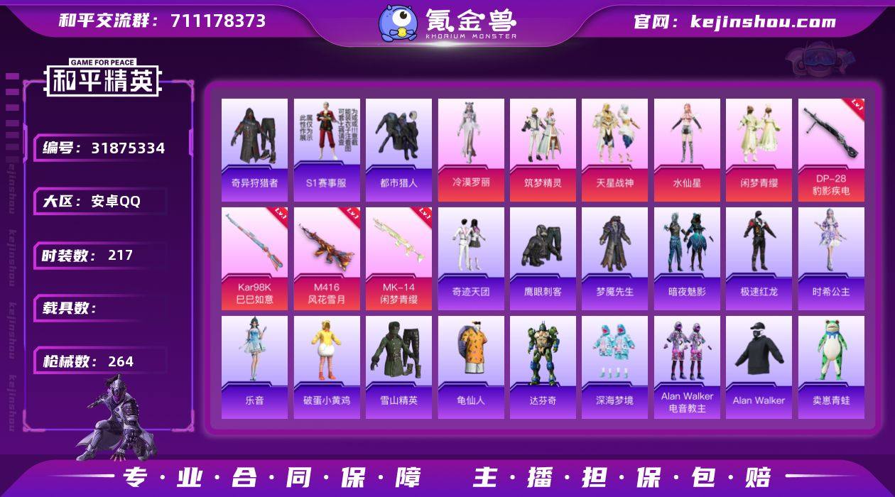 DYH18006【身法号5粉装-4特效枪 都市猎人,S1赛事外套,深海小丑鱼 风花雪月[7级]】安卓手Q-5粉装-4特效枪-217套装-264枪皮-17王牌印记-荣耀皇冠Ⅴ-82785热力值【5粉装】角色-水仙星,闲梦青缨,天星战神,筑梦精灵,角色-冷漠罗丽【4特效枪】M416-风花雪月[7级],DP-28-豹影疾电[5级],Kar98K-巳巳如意[5级],Mk14-闲梦青缨[7级]【6稀有】都市猎人,S1赛事外套,深海小丑鱼,奇异狩猎者,AKM-缤纷海域,汤姆逊-奇异狩猎者【9飞行器】终极赛罗飞行器,红色滑翔尾迹,顶峰精英尾迹,异域银装飞行器,狂鲨锋刃飞行器,齐天大圣飞行器,鸡智如我飞行器,马上有福飞行器,炫彩糖果飞行器【2头盔】深海小丑鱼头盔,银河战甲头盔【1背包】梦幻火箭背包【466其它衣服和枪皮】战术大师,角色-贝吉塔,极乐追光,SS21特训,朱霞炽焰,探宝勇士,鹰眼刺客,竞技勇士朋克,华灯初上,长空猛禽,SS19特训,竞技角斗士,霓虹极客,雪绒豹,妙红点点,青玉碎影,火舞潮人,SS34特训,凌霄紫焰,SS22特训,红色运动,荣耀,玩偶服-卖崽青蛙,极地朋克,幻彩翩翩,薄荷星砂,SS5特训,音速流光,光之冒险,酒红色名流,彩虹兔,空岛之星,黄色运动,精神漫游,SS28特训,巳巳如意,奇迹天团,鹤鸣,魅力单车,SS8特训,SS25特训,星途旅人,人气偶像,懵萌河马,SS23特训,异彩先驱,角色-乐音,灼焰舞者,夏日倾情,SS27特训,都市魅力,冰冻风暴,幻影武者,白兰地假日,沙漠兵团,冰河战士,坚韧舞者,滨海厨神,极速红龙,蝶变,元气之梦,云朵鹅,飞驰魅影,王牌教练,破蛋小黄鸡,玉兔迎春,SS31特训,SS37特训,黄色名流,甜蜜熊情侣,甜梦熊熊,角色-情公主,萌趣咩咩,惊鸿侠骨,烈火街头,空投萌叽,战地督导,破晓战魂,风暴特警,深海梦境,SS11特训,神气柴柴,漫游都市,霓虹街区,弄潮海豚,SS13特训,SS18特训,耀粉歌者,麻辣教官,暗夜魅影,雪山精英,田园牧歌,本愿之火,荧惑魅影,特训学院,疯狂小兔子,白色伏地魔,SS35特训,紫幽梦,