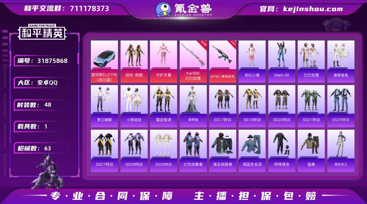 LK262617 安卓 手Q-2粉装-2特效枪-1载具-1粉色飞行器-21480热力值-2王牌印记-48套装-63枪皮 【热门品类】:套装-粉红小猪,角色-Mark.06 【粉色套装】:套装-创世·救赎,角色-守护天翼 【粉色枪皮等级】:M762-青锋波束(一级),Kar98K-巳巳如意(五级) 【粉色载具】:路特斯ELETRE(冰川蓝) 【粉色枪皮】:M762-青锋波束,Kar98K-巳巳如意 【粉色飞行器】:镜域双华-灵镜之阶 【粉色降落伞】:守护天翼降落伞,临安公主降落伞,鬼刀降落伞 【稀有套装】:套装-巳巳如意,套装-雏菊兔兔,套装-萝兰蝴蝶,套装-小熊娃娃,套装-镭金极速,角色-海琴烟 【稀有枪皮】:AKM-环太平洋,AKM-虎虎生威,SCAR-L-炫彩节奏,M416-红色方程式,AUG-耀粉歌者,M762-天降萌叽,UZI-天降萌叽,UMP45-生命誓言,Vector-创世·救赎,汤姆逊-环太平洋,P90-巳巳如意,Kar98K-彩虹符号,Mini14-旋转彩虹,莫辛纳甘-镭金极速,SVD-冷漠罗丽,S686-巳巳如意,S12K-幻世战舞者,DP-28-彩虹符号,DP-28-闪光银龙,MG3-幻世战舞者,R1895-镭金极速,R45-幻彩电音,大砍刀-盛世惊鸿,大砍刀-鬼刀 【其他套装】:套装-SS17特训,套装-SS19特训,套装-SS20特训,套装-SS21特训,套装-SS25特训,套装-SS27特训,套装-SS28特训,套装-SS29特训,套装-幻世战舞者,套装-海岛探路者,套装-湖蓝色名流,套装-特殊使命,套装-猛禽,套装-竞技名士,套装-粉红小猪,套装-绮丽涂鸦,套装-缤纷果语,套装-蓝彩潮人,套装-长空猛禽,套装-青年教官,套装-魅力单车,套装-黄色名流,套装-龙的传人,套装-纯真浪花,套装-热情海星,套装-曼妙人鱼,套装-创世·幻影,套装-铁血战翼,角色-Mark.06,套装-粉日山川 【营地ID】:788302530
