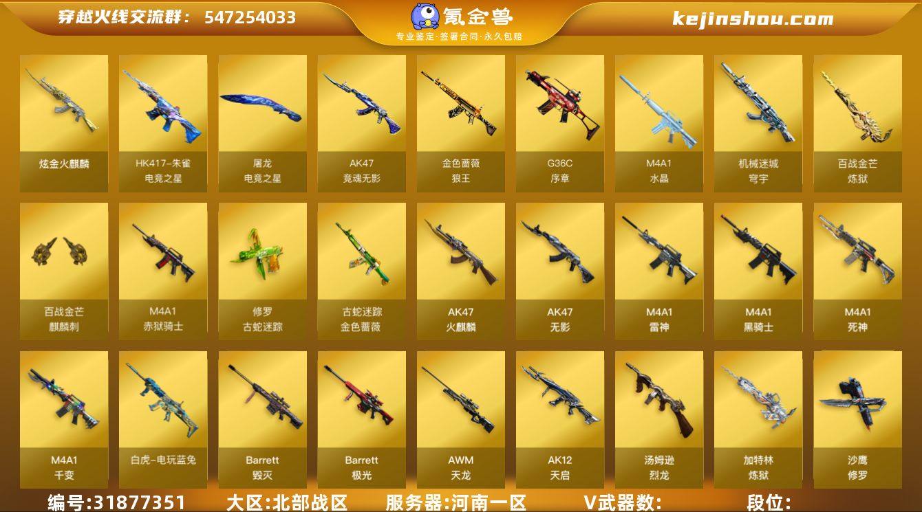 云南一区-54V-5王者武器数-4炫金武器数 【热门武器】:QBZ03-金色蔷薇,M200-幻神,死亡之眼,牛牛-AK47,M4A1-黑骑士,RPK-盘龙*2,沙鹰-修罗*3 【王者炫金武器】:王者之心,炼狱-悦蓝*2,王者之锋,炫金无影,炫金黑龙*2,炫金修罗 【音效卡】:M4A1-雷神音效卡,M4A1-黑骑士音效卡,Barrett-毁灭音效卡,QBZ03-天罚音效卡,Barrett-碧霄极光音效卡 【皮肤】:雷神-能量核心,雷神-星空,雷神-源计划2.0专属 皮肤,毁灭-荣耀之怒,毁灭-AG-CFPLS15冠军,毁灭-虹光风暴 皮肤,黑骑士-暗月,无影-暗月*3,死神-秘银,战神-紫绶金章皮肤*7,战神-流金岁月皮肤*2,天龙-能量核心,AWM-天龙-传奇70KG,修罗-能量核心,天神-暗月,龙啸-纸灯龙皮肤 【角色】:葵,樱,雨墨,机械姬,零·纪元,乔伊教练,暗夜-X,北极狐-X,飞虎队-X,风暴女,嘉年华灵狐,娟娟,兰-海滩派对,灵狐者-X,灵狐者-黄金海岸,潜龙队-X,蛇姬,蜀雪,铁骑荣耀,夜玫瑰-宠粉,樱-战斗天使,影武者-X,游珑儿 【人偶武器】:火麒麟-灵狐,AWM-灵狐-15周年嘉年华,COP-旗袍,牛牛-AK47,迷你深渊冰龙,迷你裂空之翼,夺魂,闪光弹-小乔,迷你巨石泰坦-魔花研究所 【暴走生化】:死亡之眼,超级对讲机 【挑战大师】:激光毁灭者III,神圣爆裂者-末日III*3,阐释者III 【英雄级武器】:AK47-火麒麟,M4A1-黑龙,M4A1-雷神*2,M4A1-黑骑士,M4A1-死神,AK47-黑武士,M4A1-武圣,M4A1-龙血,QBZ03-天罚,黑武士-锦绣游龙,M4A1-玫瑰精灵,QBZ03-金色蔷薇,M4A1-猎神,AK-47-猩红传说*6,AK47-B-战神,Barrett-毁灭*2,AWM-裁决,M200-幻神,VSK-94-金蚀,王者之怒-觉醒版,RPK-盘龙*2,沙鹰-修罗*3,沙鹰-天神*3,Glock18-武圣,屠龙,龙啸,擎天*2,麒麟刺,高爆手雷-雷霆,手雷-动感闪耀,闪光弹-雷霆*2,烟雾弹-雷霆,烟雾弹-古蛇迷踪,M4A1-赤...