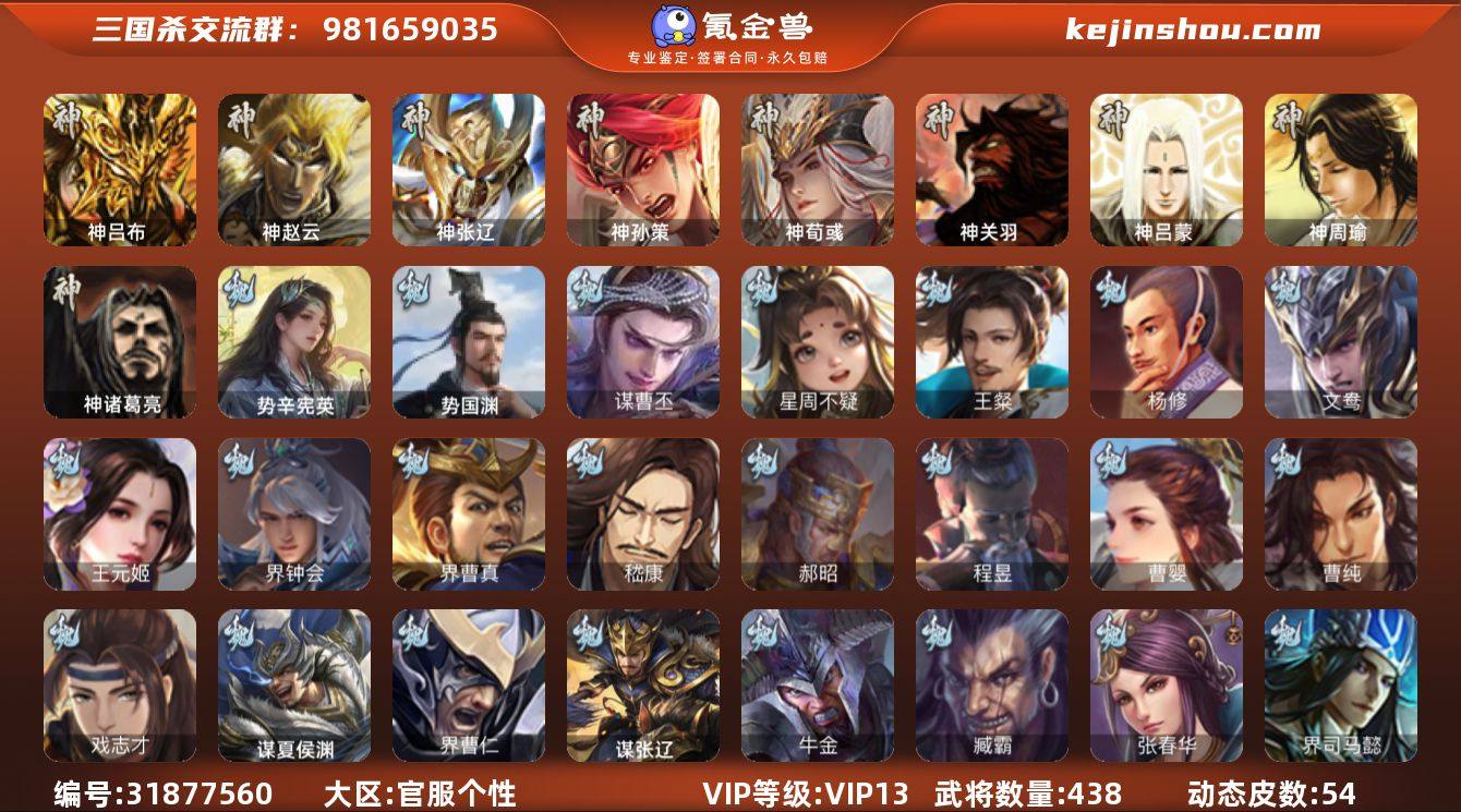 官阶:大将军;VIP等级:VIP13;史诗武将数量:61;动态皮肤数量:54;武将总数:438;史诗宝珠数量:12;将魂数量:2288;神将:6;魏国史诗武将:30;蜀国史诗武将:16;吴国史诗武将:15;群史诗武将:12