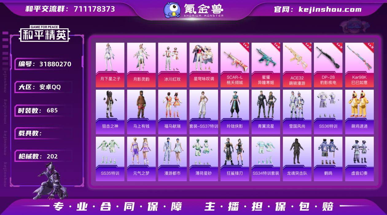 实名:可二次实名 是否支持人脸包赔:支持 粉装数量:4 特效枪数量:5 时装数:685 枪械数:202 冰川红玫,星穹咏叹调,月下星之子,月影灵韵 七级SCAR-L-桃夭倾城,六级蜜獾-异瞳寒姬,五级ACE32-萌骑漫游,五级DP-28-豹影疾电,五级Kar98K-巳巳如意 狙击之神,马上有钱,福马献瑞,SS37特训,玲珑侠影,青翼流星,雪国风尚,SS36特训,炫彩糖果,萌鸡速递,SS35特训,元气之梦,漫游都市,薄荷星砂,狂鲨锋刃,SS34特训套装,Alan Walker,冰川特警,缤纷果语,滨海厨神,冰河战士,白糯汤圆,白色伏地魔,白熊同盟,彩虹兔,长空猛禽,潮流炫酷,超能勇士,春日漫步,创世·追猎,顶瓜瓜,蝶变,大橘大利,都市魅力,风暴特警,绯格组合,粉红小猪,粉恋花,福星高照,飞行日记,龟仙人,光之冒险,贵族骑装,红潮炫舞,海岛探路者,鹤鸣,湖蓝色名流,活力之心,幻世保卫者,黑色伏地魔,黄色伏地魔,黄色名流,黄色运动,红色运动,幻世战舞者,和煦暖阳,幻影武者,极地朋克,酒红色名流,惊鸿侠骨,橘黑制服,娇憨猪猪,竞技达人朋克,竞技名士,吉莉礼服,极速红龙,街头潮人,街头风暴,锦衣飞扬,空岛之星,蓝冰羽,蓝彩潮人,蓝调潮人,龙的传人,龙魂突击队,猎鹰,六六大吉,琉璃情波,蓝色守护者,蓝色运动,龙腾端午,恋语绒绒,冷焰舞者,猛禽,梦幻奶油,萌黄之夏,魅力单车,麻辣教官,萌趣咩咩,霓虹街区,霓虹热舞,柠萌假日,牛气冲天,牛气满满,破蛋小黄鸡,破晓战魂,青春校园,轻风白浪,绮丽涂鸦,青年教官,清新柠檬,青玉碎影,云朵鹅,荣耀,人气偶像,燃烧卡路里,热血骑手,生化防暴队,深蓝色名流,森林游猎者,沙漠兵团,SS15特训,SS16特训,SS17特训,SS18特训,SS19特训,SS20特训,SS21特训,SS22特训,SS23特训,SS24特训,SS25特训,SS26特训,SS27特训,SS28特训,SS29特训,SS30特训套装,SS31特训套装,SS32特训套装,SS33特训套装,巳巳如意,酸甜橘柚,甜蜜熊情侣,涂山之恋,特训学院,甜心亚梦,团圆交子,田园牧歌,特战英豪,特战装甲,完美偶像,王牌教练,雪绒豹,旭日情侣,夏日倾情,血色贵族,香桃花海,星途旅人,虚音幻奏,星夜迷魅,耀粉歌者,玉兔迎春,野性战心,英勇保护者,鹰眼刺客,鱼渊荷华,燕燕于飞,异域银装,战地督导,智谋强哥,紫幽梦,灼焰舞者 炫彩糖果飞行器,星之彼岸飞行器,月下星之子飞行器,极意拳锋降落伞,炫彩糖果降落伞,异瞳寒姬降落伞,彩虹独角兽降落伞,环太平洋降落伞,冷漠罗丽降落伞,桃夭倾城降落伞,未来领航者降落伞,旋转彩虹降落伞 卖家说:急出!我急用钱!可砍价!!可砍价!!!皮服超多! 请各位少年/公主买!!!呜呜呜~QQ里面还有一个超级会员,请各位买吧。别再用你们的屠龙刀了,呜呜呜~