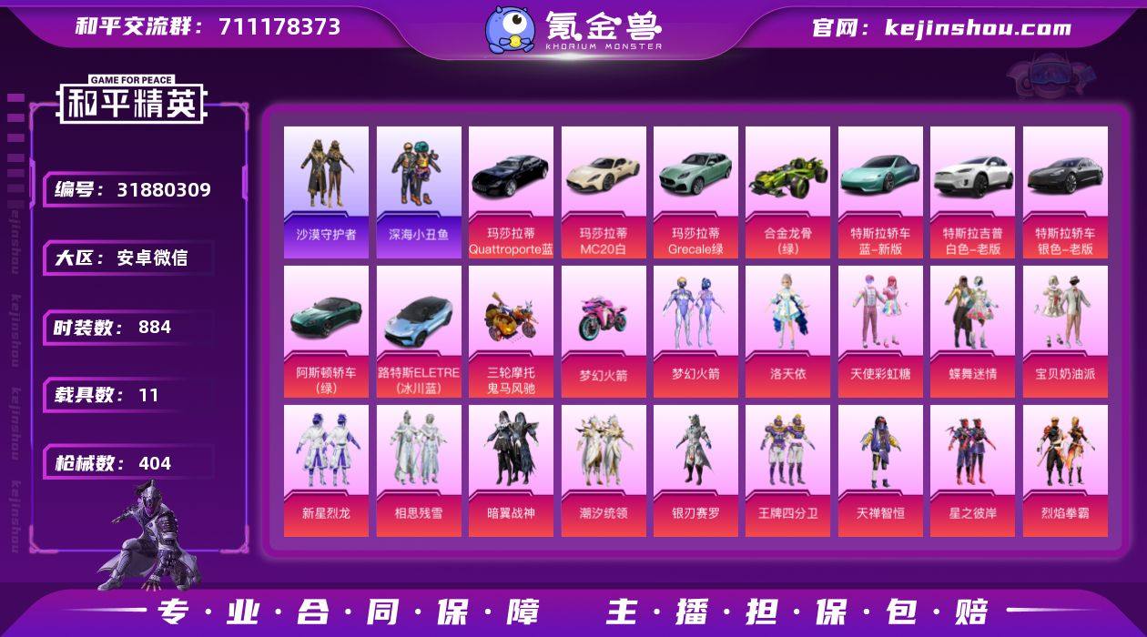 DB5581-安V-可改实名可转区-战神框-27印记-33粉装-19特效枪-11载具 小白龙-宝贝奶油派-新101-黑丝-蓝螳螂-粉螳螂-小丑鱼 AK甜心宝贝4级-UMP-相思残雪7级-M4五爪金龙7级-AUG星之彼岸7级-死噶梦幻火箭7级-狗砸旋转彩虹2级 水滴蓝特斯拉-绿合金龙骨-绿阿斯顿马丁-蓝路特斯-蓝玛莎拉蒂-银特斯拉-白特斯拉-绿玛莎拉蒂 安卓微信-27王牌印记-有战神框-33粉装-19特效枪-11载具-热力值-261套装-404枪皮-1卓越印记 【33粉装】套装-灵感创作师,套装-星之彼岸,套装-天使彩虹糖,套装-葫芦兄弟,套装-旋转彩虹,套装-烈焰拳霸,角色-烟云彩露,套装-潮汐统领,套装-新星烈龙,套装-蝶舞迷情,套装-绒雪飘舞,套装-傲雪凌霜,套装-相思残雪,套装-垂柳戏鸭,套装-朗月武圣,套装-流星咚咚,套装-齐天大圣,套装-盖世英雄,角色-复仇流浪者,套装-霓裳武神,套装-霁雪冰心,套装-彩虹甜喵,套装-天禅智恒,套装-千面幻镜,套装-骨龙祭渊,套装-暗翼战神,套装-王牌四分卫,套装-宝贝奶油派,套装-暖熊萌萌,套装-银刃赛罗,角色-洛天依,套装-梦幻火箭,套装-蜜桃特工 【19特效枪】AKM-甜心宝贝/4级,DP-28-枪炮玫瑰/7级,汤姆逊-怪笑疯兔/4级,M16A4-垂柳戏鸭/2级,UMP45-相思残雪/7级,DP-28-豹影疾电/4级,M416-五爪金龙/7级,M249-绒雪飘舞/1级,M416-暖熊萌萌/1级,AUG-星之彼岸/7级,Kar98K-巳巳如意/4级,M762-甜蜜誓约/7级,M249-彩虹甜喵/3级,Vector-环太平洋/7级,VSS-烈焰拳霸/2级,DP-28-扶摇飞仙/5级,SCAR-L-梦幻火箭/7级,GROZA-旋转彩虹/2级,MG3-洛神天依/4级 【6稀有紫装】Mark.06,8号机,深海小丑鱼,沙漠守护者,龟仙人,暗夜魅影 【11稀有载具】特斯拉Roadster(水滴蓝),玛莎拉蒂Quattroporte(夜幕蓝),阿斯顿·马丁DBS(绿),特斯拉Model 3(冷光银),特斯拉Model X(珍珠白),玛莎拉蒂Grecale(薄荷绿),路特斯ELETRE(冰川蓝),玛莎拉蒂MC20(星石白),合金龙骨(绿),双人摩...