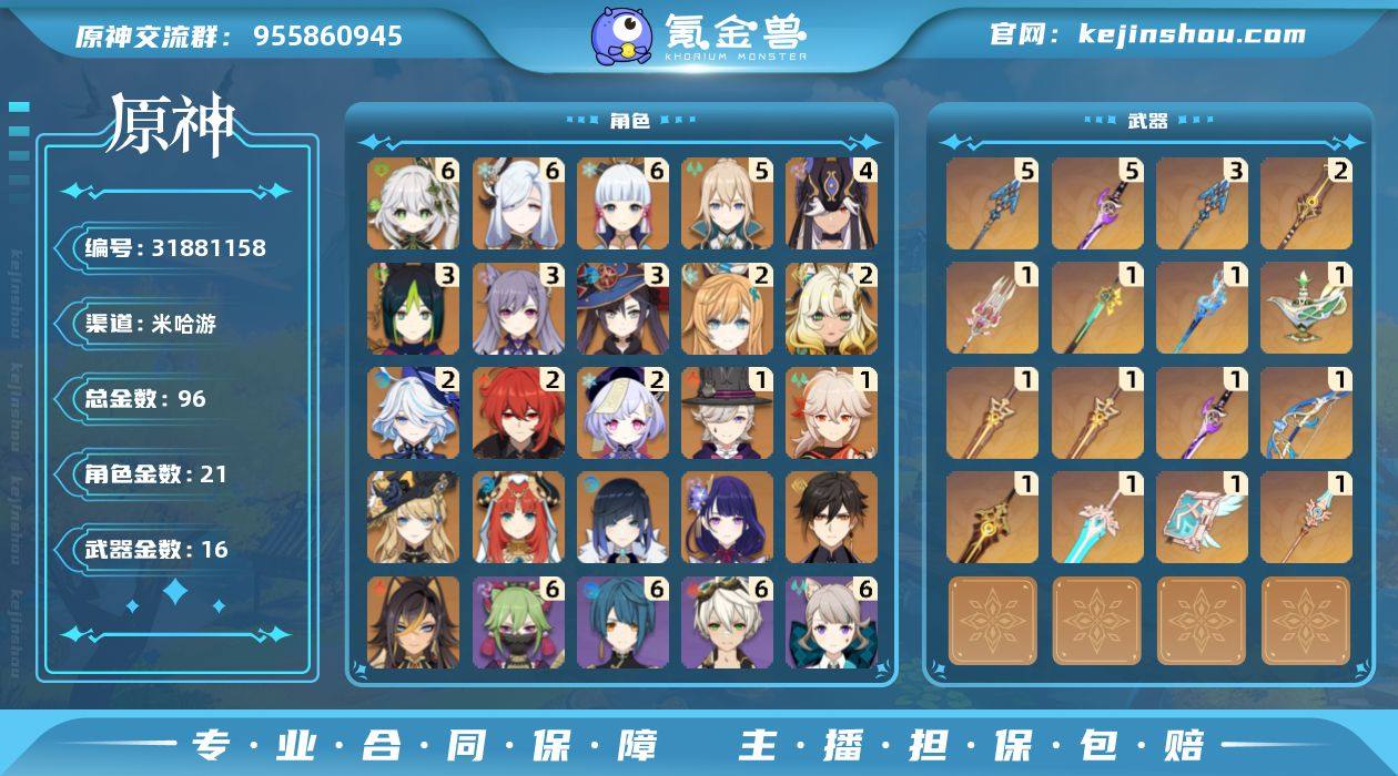 3满命 绫华申鹤草神 精5雾切 息灾 优质账号。绫华厨会非常喜欢 草队配置也不错的。