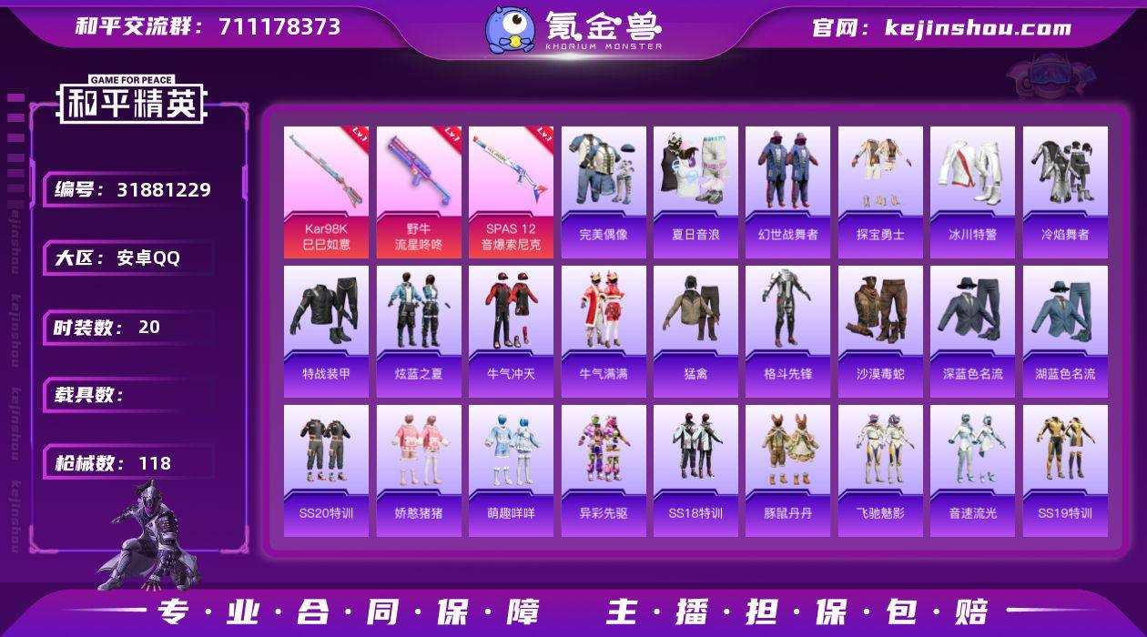 枪-67套装118枪皮33807热力值- Kar98K-巳巳如意 (5级) DP-28-豹影疾电 (4级) AMR-智耀战神 (5级) 野牛-流星咚咚 (7级) SPAS-12-音爆索尼克 (5级)】Q等级27(1太阳)可二次 安卓Q-5特效枪4热门67套装118枪皮 33807热力值 历史荣耀皇冠Ⅰ 【5特效枪】 Kar98K-巳巳如意 (5级) DP-28-豹影疾电 (4级) AMR-智耀战神 (5级) 野牛-流星咚咚 (7级) SPAS-12-音爆索尼克 (5级) 【4热门】大橘大利 冰河战士 团圆交子 瑞龙福将 豚鼠丹丹 M762-瑞龙福将 【1背包】 幻影战神背包安卓Q区-5特效枪-33807热力值-67套装-118枪皮【特效枪等级】:Kar98K-巳巳如意(五级- Kar98K-巳巳如意)野牛-流星咚咚(七级- 野牛-流星咚咚)SPAS-12-音爆索尼克(五级- SPAS-12-音爆索尼克)【优质武器皮肤】: Kar98K-巳巳如意 野牛-流星咚咚 SPAS-12-音爆索尼克【稀有武器皮肤】: SCAR-L-海盐豹豹 Kar98K-巳巳如意 Mk47-极冰使者 20-H-乌木金纹 野牛-流星咚咚 SPAS-12-音爆索尼克 M416-红色方程式 M416-蓝色火焰 M416-夜灯 M416-绯红前夜 AKM-环太平洋 AKM-彩虹符号 AKM-海渊国主 AKM-龙的传人 AKM-虎虎生威 AKM-霓虹街区 SCAR-L-玉兔迎春 SCAR-L-龙宫之主 SCAR-L-炫彩节奏 M16A4-蓝色火焰 GROZA-异彩先驱 GROZA-彩虹符号 AUG-耀粉歌者 QBZ-飞驰魅影 M762-瑞龙福将 M762-深海曼妙 M762-彩虹甜喵 M762-天降萌叽 Mk47-乌木金纹 Mk47-天之羽翼 Mk47-妙红点点 G36C-乌木金纹 AC-VAL-天降萌叽 AC-VAL-乌木金纹 蜜獾-天降萌叽 蜜獾-垂柳戏鸭 蜜獾-娇憨猪猪 Kar98K-乌木金纹 Kar98K-飞驰魅影 Kar98K-彩虹符号 Kar98K-炫彩