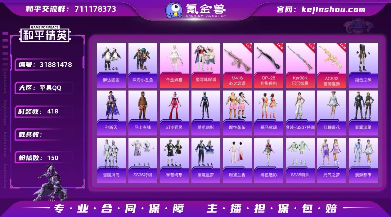 实名:可二次实名 是否支持人脸包赔:支持 粉装数量:2 特效枪数量:4 时装数:418 枪械数:150 胖达圆圆,深海小丑鱼 千金淑猫,星穹咏叹调 七级M416-心之恋语,五级DP-28-豹影疾电,五级Kar98K-巳巳如意,二级ACE32-萌骑漫游 狙击之神,孙斩天,马上有钱,缚爪幽影,幻步猫灵,魔性柴柴,福马献瑞,红釉青花,SS37特训,雨过天青,青翼流星,雪国风尚,画境星梦,琴音绮想,SS36特训,炫彩糖果,粉黛兰香,绯色魅影,SS35特训,元气之梦,漫游都市,懒羊羊,薄荷星砂,狂鲨锋刃,凌霄紫焰,SS34特训套装,朱霞炽焰,暗影哥特,冰冻风暴,缤纷果语,滨海厨神,冰河战士,白色伏地魔,彩虹兔,长空猛禽,超能勇士,顶瓜瓜,大橘大利,呆萌铁蟹,都市魅力,粉恋花,诡面顽熊,龟仙人,鹤鸣,黑色伏地魔,黄色运动,黑夜传说,幻影武者,惊鸿侠骨,竞技角斗士,竞技名士,吉莉礼服,街头风暴,锦衣飞扬,金耀舞者,空岛之星,狂沙舞者,蓝冰羽,蓝彩潮人,凛冬战士,龙魂突击队,浪漫天命,蓝色运动,猎影月神,漫步者,魅力单车,懵萌河马,霓虹街区,霓虹热舞,柠萌假日,破蛋小黄鸡,胖达圆圆,破晓战魂,云朵鹅,荣耀,深海小丑鱼,神气柴柴,SS23特训,SS24特训,SS25特训,SS26特训,SS27特训,SS28特训,SS29特训,SS31特训套装,SS32特训套装,SS33特训套装,甜梦熊熊,涂山之恋,特训学院,铁血战翼,WiFi精灵,王牌教练,雪绒豹,旭日情侣,雪山精英,雪鹰学院,元气发射,云霞荷露,鹰眼刺客,异域银装,紫幽梦 炫彩糖果飞行器,绝对恒星降落伞,炫彩糖果降落伞,怪笑疯兔降落伞,幻彩电音降落伞,极限特训降落伞,龙行天下降落伞,千金淑猫降落伞,守护天翼降落伞,未来战士降落伞 卖家说:合适出了