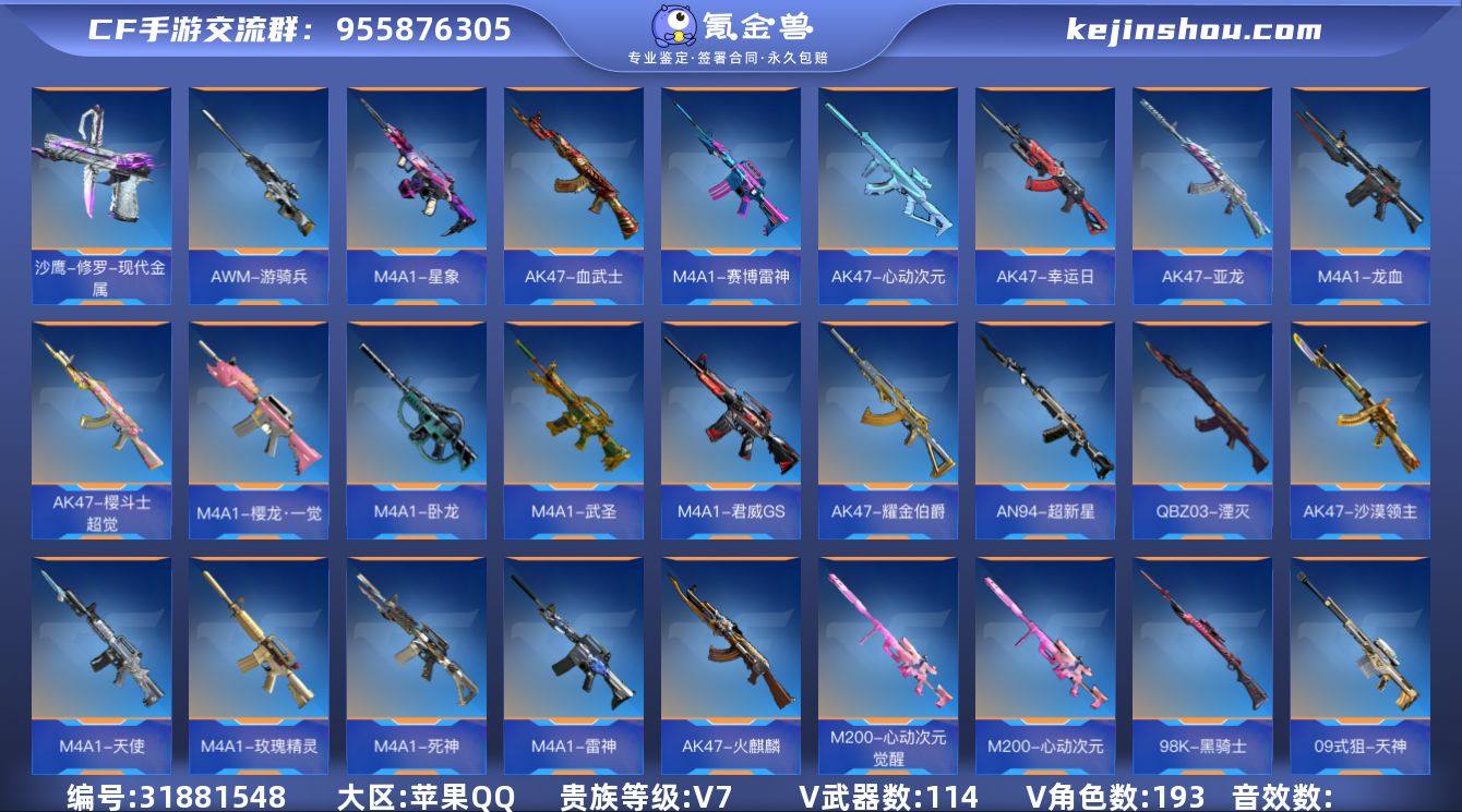 FC-Q2UP18 苹果QQ,成人号:是,角色等级:110,实名:有修改人脸机会/实名是本人,段位:枪王SSS,VIP等级:V7,V武器数量:193,V角色数量:3,V总数量:114,王者武器数:9,万化数量:210, 【人物角色】海滩夜玫瑰,香香,娜塔莎,太阳神-曦,大老师,堕天使,周年庆纪念赛斯,洛伊,萝拉,夏日灵狐,暗影,春节兰,幻影,兰,猎狐者,斯沃特,蜀雪, 【王者武器】王者之翼手雷,王者之翼闪光弹,王者之影烟雾弹,王者之翼烟雾弹,王者之影,王者之翼,王者之轮,王者之锋,王者之击, 【至尊套装】翼至尊, 【带V枪械】王者之锋-冰霜奇迹,王者之翼手雷-冰霜奇迹,王者之翼闪光弹-冰霜奇迹,王者之翼烟雾弹-冰霜奇迹,5-机械纪元-蚀刻战甲,AK47-沙漠领主-邪神,AK47-耀金伯爵-寒霜,CZS2-善财童子-千变,M4A1-赛博雷神,M4A1-龙血,沙鹰-修罗-能量核心,AK47-火麒麟-雷神,M4A1-樱龙·一觉,M4A1-星象,M4A1-卧龙,M4A1-武圣,M4A1-君威GS,M4A1-天使,M4A1-玫瑰精灵,M4A1-死神,M4A1-雷神,AK47-血武士,AK47-心动次元,AK47-幸运日,AK47-亚龙,AK47-樱斗士-超觉,AK47-冰魂,AK47-耀金伯爵,AK47-沙漠领主,AK47-火麒麟,AN94-超新星,QBZ03-湮灭,98K-黑骑士,M200-心动次元觉醒,M200-心动次元,巴雷特-枪娘,巴雷特-雷神,巴雷特-极光,王者之影-冰霜奇迹,AWM-游骑兵,09式狙-天神,加特林-堡垒觉醒,加特林-堡垒,巴雷特-极光-重型机甲,CZS2-心动次元觉醒,CZS2-善财童子,巴雷特-毁灭-寒霜,5-机械纪元,双持斯泰尔-天使,贝雷塔-力拔山河,蟒蛇-妙才,双管猎枪-黑骑士,沙鹰-火麒麟,沙鹰-修罗,USP-神罚,双持沙鹰-亚龙,CZ75-死神,