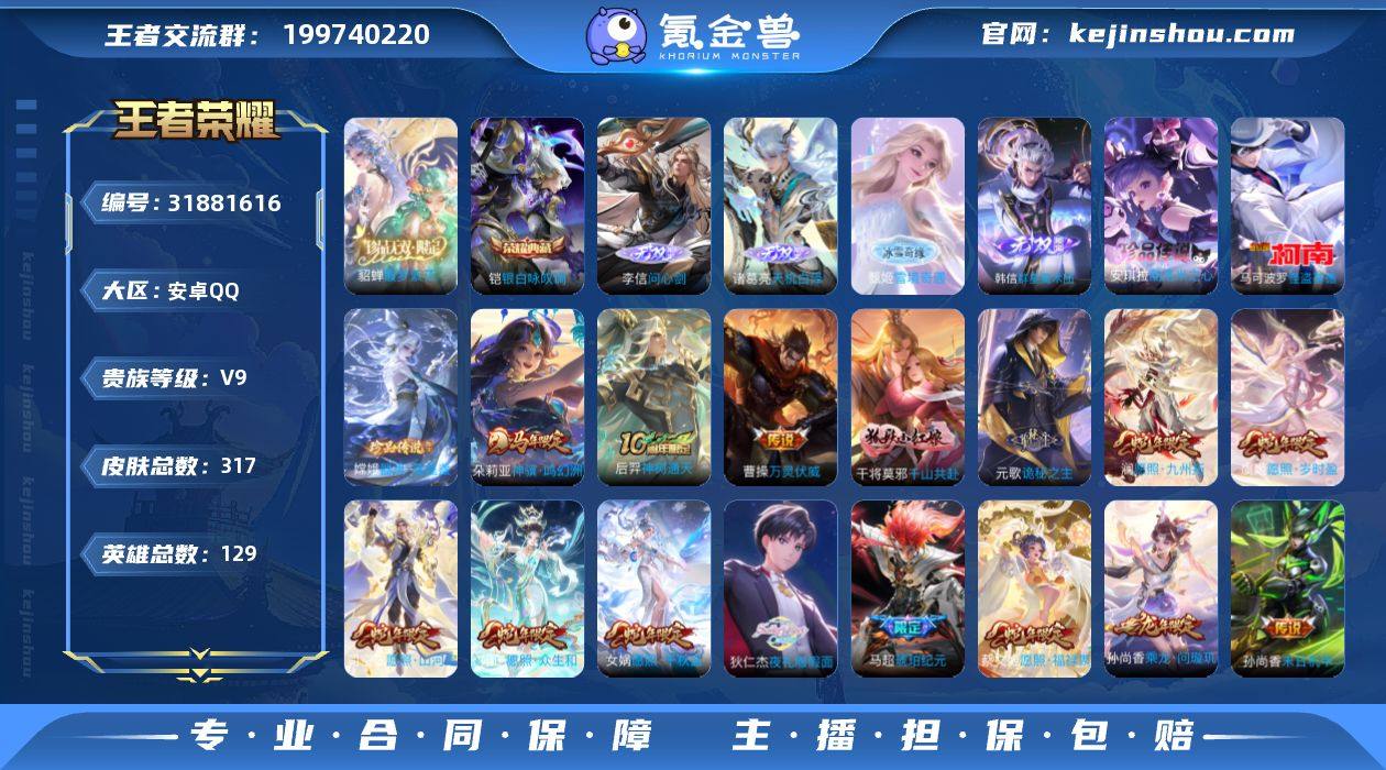 贵族等级:V9 典藏皮肤数:1 珍品无双皮肤数:1 无双皮肤数:4 珍品传说皮肤数:3 传说皮肤数:34 史诗皮肤数:97 皮肤数:317 英雄数:129 段位:无双王者 卖家说:差7000快v10,紫星币马上3000,荣耀水晶还差100抽,账号全英雄