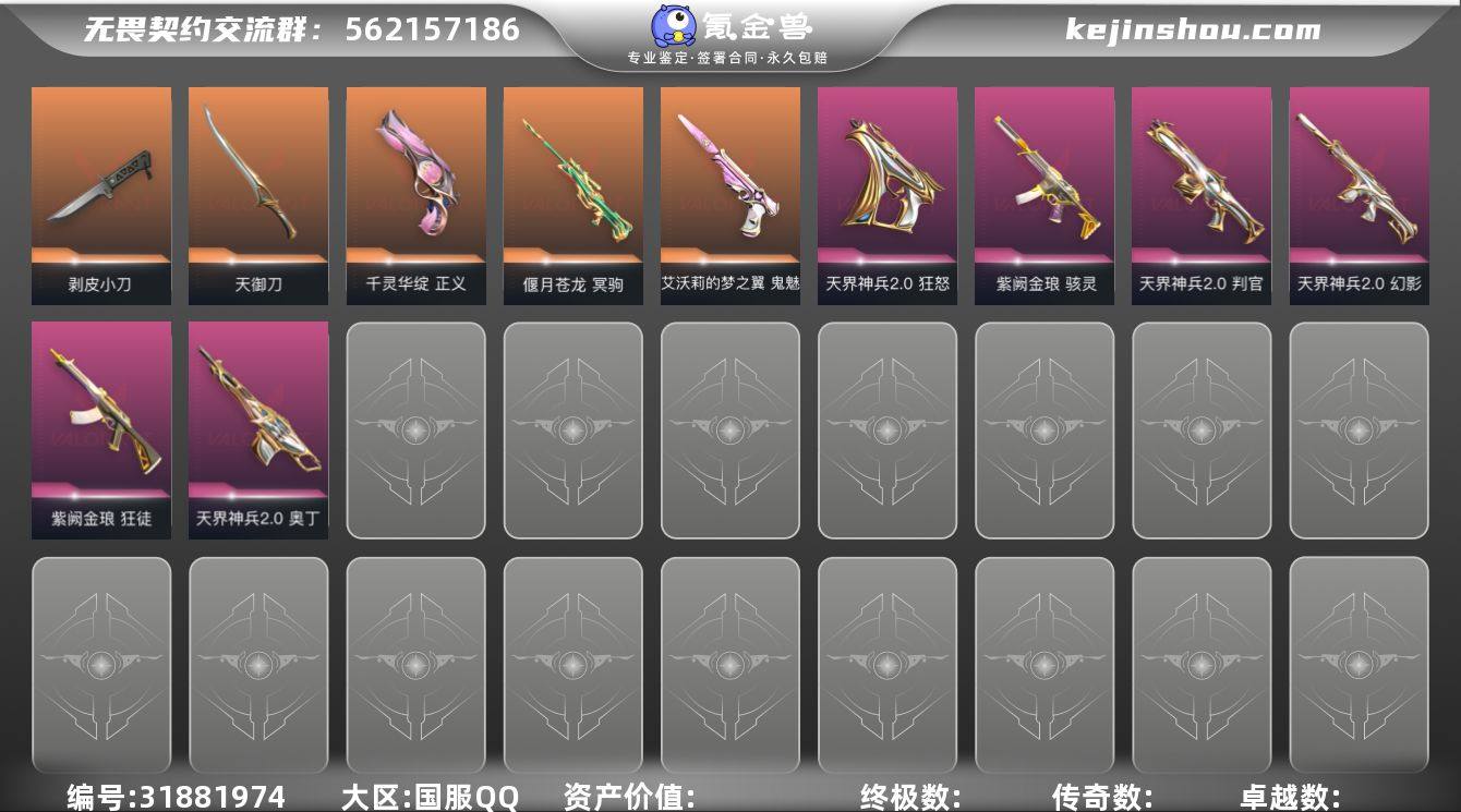 16橙皮 2金皮 9紫皮 81皮肤 28英雄 129卡面 1280已用源晶 黄金段位 【套装】VCT 2026队伍礼包,天界神兵//2.0套装 【近战武器皮肤】匕首-超限闪存,短剑-流星兵团,日耀风暴 遗器,天御刀,剥皮小刀,爪刀-RGX 11z Pro 3.0,超能偶像 应援棒 【佩枪皮肤】正义-千灵华绽,鬼魅-艾沃莉的梦之翼,狂怒-天界神兵2.0,标配-VCTxEDG 【冲锋枪皮肤】骇灵-紫阙金琅 【霰弹枪皮肤】判官-天界神兵2.0 【步枪皮肤】多弥尔的复仇 狂徒,狂徒-光荣异象,狂徒-RGX 11z pro,狂徒-混沌序曲,狂徒-紫阙金琅,狂徒-盖亚的复仇,狂徒-塑水宗,幻影-侦察力量,幻影-天界神兵2.0,幻影-源能者娱乐系统,戍卫-海洋之星 【狙击枪皮肤】飞将-西部未来,冥驹-偃月苍龙 【机枪皮肤】奥丁-天界神兵2.0 【挂饰】袖珍捷风挂饰,超能偶像挂饰,神中神挂饰,致命一击挂饰,V26第一幕纪念币 挂饰,糖葫芦挂饰,云开见日挂饰,星荷璀璨挂饰,终章KO小金人挂饰,VCTxEDG挂饰,飞刀挂饰,迷你机甲挂饰