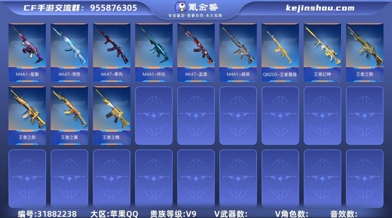 苹果QQ,成人号:是,角色等级:155,实名:有修改人脸机会/实名是本人,段位:枪神,VIP等级:V9,V武器数量:385,V角色数量:7,V总数量:281,王者武器数:33,万化数量:627, 【人物角色】关小雨,大老师,孤狼,龙的传人-王力宏,葵,洛伊,夏日灵狐,春节兰,魅惑灵狐,审判者,曼陀罗,灵狐者,斯沃特,杨玉凝,蝉,雅典娜,变装舞会兰,职场灵狐, 【王者武器】王者之兽,王者之魄-冠军珍藏,M12S-雷霆王者,王者之蝶,王者之势闪光弹,王者之心手雷,王者之影手雷,王者之兽手雷,王者之心烟雾弹,王者之心闪光弹,王者之翼闪光弹,王者之兽闪光弹,王者之影闪光弹,王者之圣闪光弹,王者之兽烟雾弹,王者之影烟雾弹,王者之圣烟雾弹,王者之势烟雾弹,王者之翼烟雾弹,闪光弹-雷霆王者,烟雾弹-雷霆王者,王者之心,王者之影,王者之怒,王者之光,王者之魂,王者之灵,王者之锋,王者之啸,王者之击,王者之迹,王者之狱,王者之隐, 【至尊套装】影至尊,怒至尊,心至尊,魄至尊, 【带V枪械】MK47-云舞-千变,M200-幻神-战舞,王者之心闪光弹-HeartShot,王者之圣闪光弹-冰霜奇迹,AK47-游骑兵-紫魇,AK47-沙漠领主-邪神,AK47-火麒麟-诸神黄昏,CZS2-善财童子-千变,M4A1-仲达,M4A1-樱龙·超觉,M4A1-星象,M4A1-卧龙觉醒,M4A1-游骑兵,M4A1-死神,M4A1-黑龙,M4A1-黑骑士,沙鹰-火麒麟-能量核心,M4A1-雷神,MK47-云舞,MK47-机械纪元,AK47-血武士,AK47-幸运日觉醒,AK47-奉先,AK47-竞技战魂,CZ75-死神-能量核心,AK47-樱斗士-超觉,COP 357-堕天神,M4A1-雷神-枪神之魄,双持柯尔特-极光-清凉夏日,AK47-Rush-星速,AK47-常胜,AK47-火麒麟-灵狐,AK47-冰魂觉醒,M4A1-黑龙-凶煞,AK47-游骑兵,AK47-牡丹精灵,AK47-沙漠领主,AK47-黑武士觉醒,M4A1-死神-能量核心,AK47-火麒麟,M4A1-游骑兵-KZ,AK...