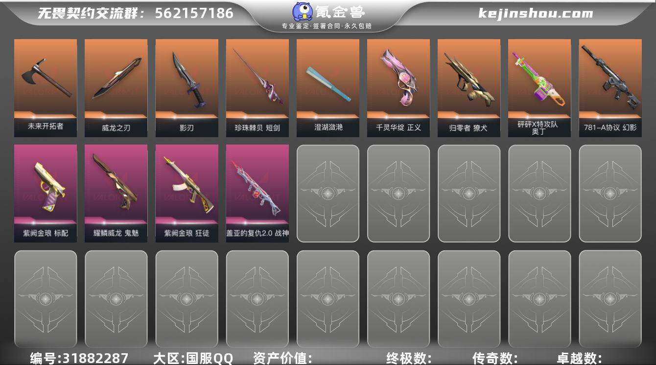 【套装】:西部未来套装,VCT 2025 赛季套装,奇点//2.0套装 【英雄】:幻棱,炼狱,维斯,暮蝶,钛狐,壹决,铁臂,捷风,雷兹,幽影,不死鸟,贤者,猎枭,蝰蛇,零,芮娜,奇乐,尚勃勒,霓虹,斯凯,夜露,星礈,K/O,海神,盖可,黑梦,钢锁 【近战 武器】:近战武器-VCT 2025 爪刀,近战武器-奇点//2.0 蝴蝶刀,近战武器-镭切,近战武器-澄湖潋滟,近战武器-珍珠棘贝 短剑,近战武器-流星兵团 短剑,近战武器-未来开拓者,近战武器-超能偶像 应援棒,近战武器-超限闪存 匕首,近战武器-盖亚之愠,近战武器-荒土机兵 热能刀,近战武器-诡秘蛇影 军刀,近战武器-神圣领域 战刀 【狂徒】:狂徒-混沌序曲,狂徒-奇点//2.0,狂徒-堕天遗武,狂徒-盖世英雄,狂徒-海洋之星,狂徒-耀鳞威龙,狂徒-离子武器//2.0,狂徒-超能偶像,狂徒-荒土机兵,狂徒-流星兵团,狂徒-漫天彩霞,狂徒 诡秘蛇影 【幻影】:幻影-黯夜怪谈,幻影-光明哨兵//2.0,幻影-西部未来,幻影-般若假面,幻影-超限闪存,幻影-珍珠棘贝,幻影-神圣领域,幻影-聚合之力,幻影-纳米打击,幻影-末日之翼,幻影-西部未来 【戍卫】:戍卫-破败军械,戍卫-超能偶像,戍卫-珍珠棘贝,戍卫-浮光跃金,戍卫-逆冲蛮牛,戍卫-战术熊与伙伴们,戍卫-月球哨兵,戍卫-折光棱晶 【獠犬】:獠犬-781-A协议,獠犬-归零者,獠犬-漫天彩霞,獠犬-神圣领域,獠犬-采蜜小蜂队,獠犬-复古浪潮,獠犬-模拟赫兹,獠犬-逆冲蛮牛 【冥驹】:冥驹-堕天遗武,冥驹-荒土机兵,冥驹-复古浪潮,冥驹-模拟赫兹,冥驹-星云暗涌 【飞将】:飞将-塑水宗,飞将-西部未来,飞将-聚合之力,飞将-战术熊与伙伴们,飞将-末日之翼 【莽侠】:莽侠-RGX 11z Pro//3.0,莽侠-超限闪存,莽侠-诡秘蛇影,莽侠-深海水族,莽侠-纤云弄巧,莽侠-月球哨兵 【战神】:战神-神圣领域,战神-采蜜小蜂队,战神-浮光跃金,战神-深海水族 【奥丁】:奥丁-全息波普,奥丁-西部未来,奥丁-流星兵团,奥丁-纳米打击,奥丁-末日之翼 【判官】:判官-偃月苍龙,判官-超能偶像,判官-诡秘蛇影,判官-采蜜小蜂队,判官-纳米打击x 【雄鹿】:雄鹿-离子武器,雄鹿-复古浪潮,雄鹿-模拟赫兹,雄鹿-逆冲蛮牛,雄鹿-月球哨兵 【骇灵】:骇灵-光明哨兵//2.0,