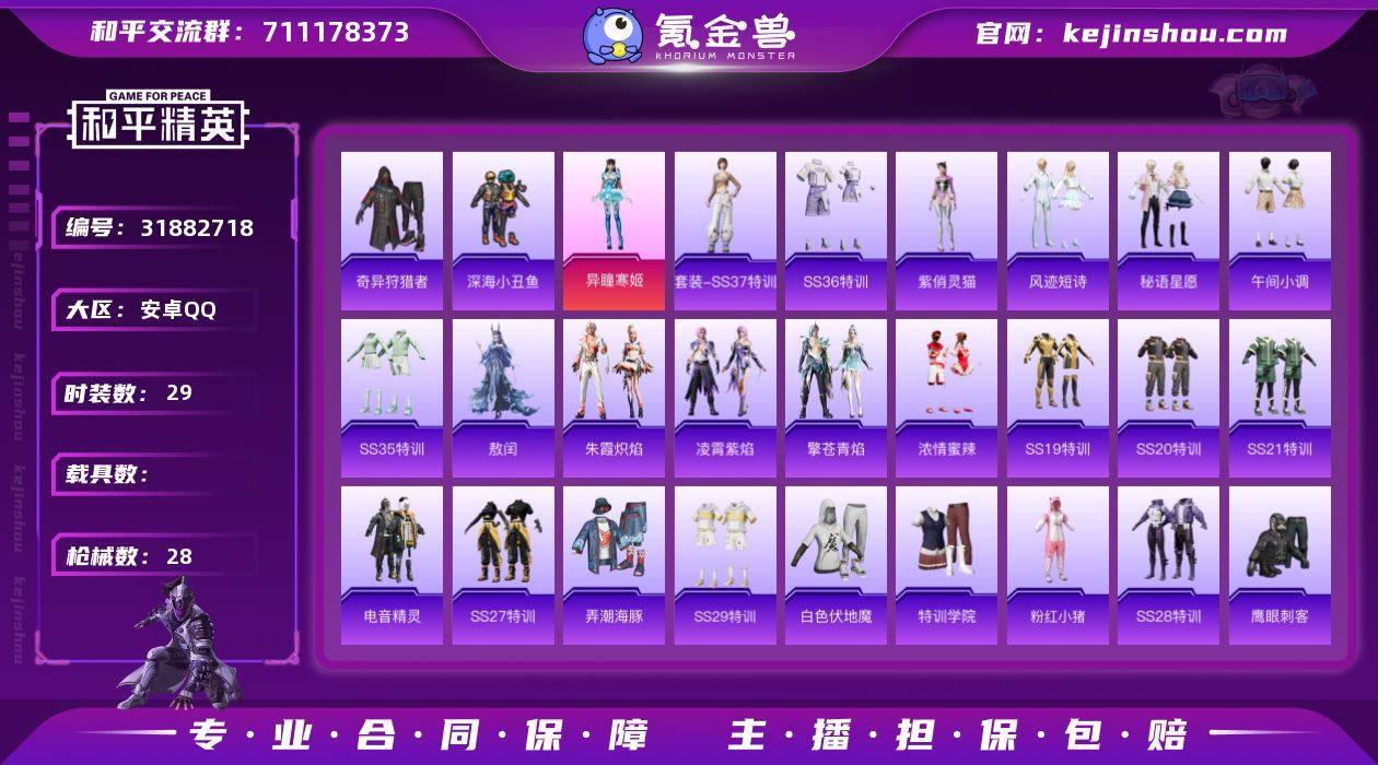 【和平精英】1粉装,4特效枪,0载具,历史最高段位:卓越王牌13星 王牌印记2次 热力值:29991,87套装,100枪械,111装备,49战备;套装:角色-异瞳寒姬,套装-特训学院,套装-黄色伏地魔,套装-白色伏地魔,套装-黑色伏地魔,套装-竞技名士,套装-酒红色名流,套装-湖蓝色名流,套装-猛禽,套装-长空猛禽,套装-海岛探路者,套装-旭日情侣,套装-特战装甲,套装-特殊使命,套装-甜蜜告白,套装-春日漫步,套装-鹰眼刺客,套装-完美偶像,套装-神秘领域,套装-魅力单车,套装-竞技达人朋克,套装-热血青春,套装-幻世战舞者,套装-奇异狩猎者,套装-弄潮海豚,套装-迅捷狂鲨,套装-深海小丑鱼,套装-青涩时光,套装-元素星魂,套装-麻辣教官,套装-粉红小猪,套装-鹤鸣,套装-霓虹街区,套装-白熊同盟,套装-夏日音浪,套装-探宝勇士,套装-白糯汤圆,套装-战术大师,套装-狙击之神,套装-牛气冲天,套装-电音精灵,套装-SS19特训,套装-浓情蜜辣,套装-炫蓝之夏,套装-SS20特训,套装-SS21特训,套装-龟仙人,套装-香桃花海,套装-漫游都市,套装-SS27特训,套装-恋语绒绒,套装-SS28特训,套装-街头风暴,套装-海盐绵绵冰,套装-SS29特训,角色-紫俏灵猫,套装-星途旅人,角色-俏兔智灵,套装-SS30特训,套装-SS31特训,套装-智谋强哥,套装-SS33特训,套装-巳巳如意,套装-SS32特训,套装-青翼流星,套装-狂鲨锋刃,套装-大橘大利,套装-炫彩糖果,套装-元气之梦,套装-SS34特训,套装-擎苍青焰,套装-朱霞炽焰,套装-凌霄紫焰,角色-敖闰,套装-薄荷星砂,套装-SS35特训,套装-午间小调,套装-秘语星愿,套装-风迹短诗,角色-超感刻度,套装-SS37特训,套装-SS36特训,套装-雪国风尚,套装-超能元气,套装-萌鸡速递,套装-福马献瑞,套装-马上有钱;枪皮:M762-奇异狩猎者,M762-橘柚倾心,M762-天降萌叽,SCAR-...
