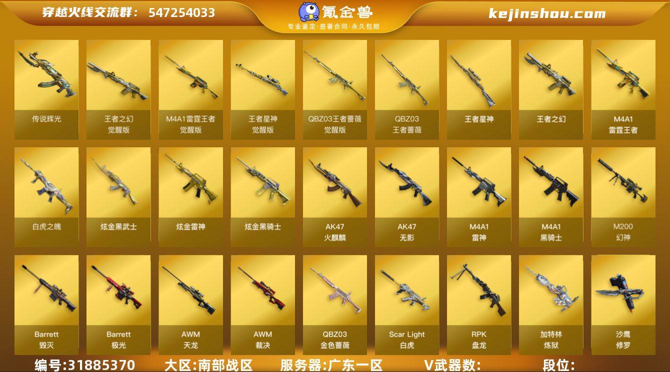 L629336 【四防传说艾莉莎/传说辉光/幻神三件套(音效卡+巅峰荣耀+丹凤)/王者星神/竞技荣光套/裁决三件套(音效卡+叶芒苍灵+运输船)/白虎三件套(音效卡+AGS20冠军)/金色蔷薇三件套(音效卡+荣耀世冠EP+冠军之薇)/白虎之魄/王者蔷薇/盘龙*4+炼狱*3/柯尔特-冠军之特/柯尔特-荣耀世冠EP*3/USP雷暴/USP冥王/USP神工天巧*3/柯尔特-竞技荣光/炽芒蝶刃/冠军之刃/四防妮妮+云悠悠+荒漠琉璃+鹰+惊若翩鸿+王者涂鸦+王者凌霄/音效卡-黑骑士+极光+毁灭+雷神/皮肤:黑骑士-白马银枪/火麒麟-大唐荣光/雷神-荣耀之魄+星空/】 会员等级6 英雄级武器数量94 【可二次实名】 【永久包赔】 【能人脸包赔】 【VIP 6】 【能排位】 【无】 稀有套装1 传说武器1 王者炫金武器13 热门武器11 英雄级武器28 稀有武器8 暴走生化6 挑战大师2 角色17 稀有皮肤32 音效卡12 投掷武器11 稀有套装:竞技荣光套; 传说武器:传说辉光; 王者炫金武器:白虎之魄,王者之魄闪光弹,王者之魄高爆手雷,王者星神,QBZ-03-王者蔷薇,炫金雷神,王者之幻,炫金武士,炫金骑士,高爆手雷-雷霆王者,M4A1-雷霆王者,烟雾弹-雷霆王者,闪光弹-雷霆王者; 热门武器:柯尔特-荣耀世冠EP,炽芒蝶刃,柯尔特-冠军之特,Scar Light-白虎,USP-雷暴,M200-竞技荣光,M200-幻神,金刚伞,Knife-冠军之刃,黄金猫猫手套-白鲨,斯泰尔-蝴蝶; 英雄级武器:烈火-动感闪耀,HK417-朱雀-电竞之星,屠龙-电竞之星,USP-冥王,机械迷城-穹宇,RPK-盘龙,无影-神兵利器,USP-神工天巧,AK47-火麒麟,AWM-裁决,AK-47-猩红传说,擎天,屠龙,柯尔特-电竞装甲,M4A1-黑骑士,Barrett-极光,加特林-炼狱,擎天-竞技荣光,柯尔特-竞技荣光,龙啸,QBZ03-金色蔷薇,M4A1-雷神,麒麟刺,沙鹰-天神,沙鹰-修罗,Barrett-毁灭,AWM-天龙,AK47-无影; 稀有武器:火麒麟-绝迹,黄金迷你裂...