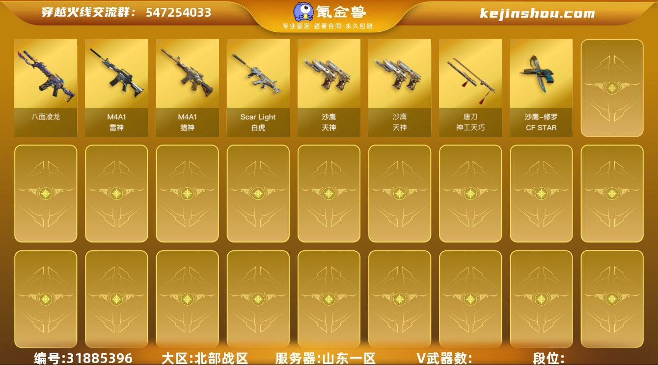 山东一区-35V-5王者-1炫金 【热门武器】:QBZ03-金色蔷薇,M200-幻神 【王者炫金武器】:USP-雷暴王者,炫金骑士 【音效卡】:白虎-盛典舞曲音效卡,炼狱-百战金芒-庆典舞曲音效卡,AWM-昌龙-怀旧音效卡 【皮肤】:裁决-流光秘银,雷神-荣耀之魄,M4A1-再燃火线,火麒麟-心动糖果,毁灭-黑大圣皮肤,轻型军用手斧-再燃火线 【角色】:战地猎狐,王者春,乔伊教练,云海玲珑,飞虎队-X,风暴女,嘉年华灵狐,娟娟,灵狐者-X,潘多拉-甜心教官,斯沃特-X,影武者-X,游珑儿 【人偶武器】:AWM-灵狐-15周年嘉年华 【暴走生化】:超级对讲机 【挑战大师】:神圣爆裂者-末日III 【英雄级武器】:AK47-火麒麟,M4A1-雷神*2,无影-神兵利器,黑武士-锦绣游龙,SCAR Light-玄豹,QBZ03-金色蔷薇,M200-幻神,炼狱-百战金芒,幻灵之锋,麒麟刺-百战金芒,丛林匕首-玄豹,高爆手雷-幻灵,高爆手雷-竞技荣光,高爆手雷-云龙,高爆手雷-玄豹,闪光弹-幻灵,闪光弹-云龙*3,闪光弹-玄豹,烟雾弹-幻灵*2,烟雾弹-云龙,烟雾弹-玄豹,M4A1-赤狱骑士,M4A1-苍鸣雷神,AWM-昌龙,Barrett-碧霄极光 【道具】:BS战队炫彩背包,CFS限定背包,亚洲杯纪念炫彩背包,百战金芒炫彩背包,背包-洛丽塔,超级背包,女皇终结者-魔龙之吻,救世主-黑桃战神,绿色巨人,灵魂忍者,迷雾幽灵,夺命之镰,防化服*3,金色流光-枪王排位*2,星辰流光-枪王排位,枪王排位28赛季金色流光,枪王排位29赛季金色流光,语音特效-盛典烟火,萌萌小葵表情,EP战队名片,EP战队喷图,防弹头盔*5,防弹衣*5,C4工具钳*5,手雷包*4 【特殊枪械】:
