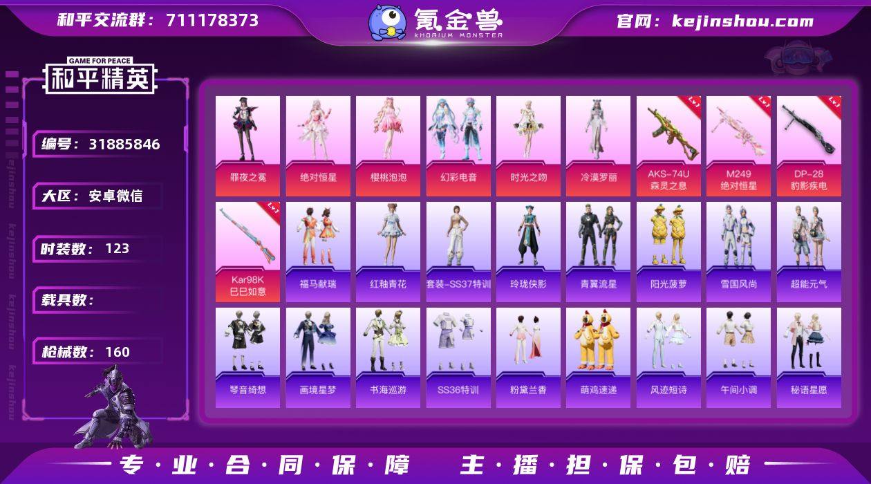 kk2222984-KK2152 苹果微信-7王牌印记-6粉装-8特效枪-44657热力值-88套装-141枪皮-6卓越印记-6传奇印记-都市猎人,Mark.06,深海小丑鱼,浪漫天命,龟仙人-电力室2级,研究所3级 【6粉装】套装-创世·救赎,套装-放客神游,套装-幻彩电音,套装-极意拳锋,角色-异瞳寒姬,套装-智能音符 【8特效枪】AUG-圣斗士星矢/7级,AMR-智耀战神/5级,破片手榴弹-瓶中星球/7级,SCAR-L-锦绣绵绵/5级,DP-28-豹影疾电/5级,Kar98K-巳巳如意/5级,M416-电玩时刻/5级,UMP45-量子极限/5级 【5稀有紫装】都市猎人,Mark.06,深海小丑鱼,浪漫天命,龟仙人 【88稀有时装】智能音符,放客神游,幻彩电音,异瞳寒姬,极意拳锋,SS35特训,午间小调,SS31特训,SS33特训,SS32特训,SS36特训,彩虹兔,申公豹,蓝冰羽,极速光影,雪绒豹,恋语绒绒,SS34特训,朱霞炽焰,紫幽梦,都市猎人,浪漫天命,龟仙人,Mark.06,深海小丑鱼,紫俏灵猫,凌霄紫焰,擎苍青焰,炫彩糖果,萌鸡速递,小鸟芋圆,元气之梦,风迹短诗,薄荷星砂,秘语星愿,粉恋花,蓝海鲸歌,云朵鹅,顶瓜瓜,创世·幻影,创世·救赎,铁血战翼,卖崽青蛙,异域银装,摩登魅猫,街头风暴,糖霜甜心,鱼渊荷华,燕燕于飞,战术大师,巳巳如意,曼妙人鱼,SS28特训,萝兰蝴蝶,贝斯之夜,焰鹰斗篷,湖雨初晴,黄色运动,SS26特训,TT战队服,漫步者,空岛之星,热情海星,纯真浪花,竞技名士,长空猛禽,旭日情侣,魅力单车,春光漫游,鹰眼刺客,冰冻风暴,幽夜迷踪,破蛋小黄鸡,快闪甜心,海岛探路者,SS27特训,蓝调潮人,机械哨兵,光之冒险,夏日倾情,缤纷果语,滨海厨神,青涩年华,幻羽潜行,海盐绵绵冰,老实芭蕉,吉莉礼服,王牌教练 【141稀有枪械】UMP45-量子极限/5级,QBZ-纯真浪花,AWM-纯真浪花,汤姆逊-纯真浪花,DBS-乌木金纹,AA12-G-纯真浪花,平底锅-纯真浪花,P1911-创世·救赎,撬棍-朗基努斯之枪,蜜獾-精灵梦叶罗