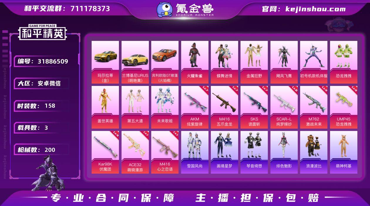 粉装9/粉枪9/载具3/珍稀飞行器130245,72239,72252,72266,72306/套装158/枪皮200/热力值79500/历史最高段位:王牌印记12次/Lv:68/七级AKM-炫紫旋律/六级SCAR-L-纯梦嫁纱/七级M416-五爪金龙/一级M416-心之恋语/四级M762-激战未来/一级ACE32-萌骑漫游/四级UMP45-恐龙拽拽/四级Kar98K-伏魔团/七级SKS-诡面斩/忠义严颜/六号树人/龟仙人/浪漫波比/粉红小猪/红红火火/大砍刀-青龙偃月刀/撬棍-龙胆亮银枪/火曜朱雀/蝶舞迷情/金属狂野/飓风飞鹰/初号机款机体服/恐龙拽拽/盖世英雄/第五大道/未来歌姬/兰博基尼URUS(明艳黄)/玛莎拉蒂Ghibli(金)/宾利欧陆GT敞篷(火焰橘)/AKM炫紫旋律/SCAR-L纯梦嫁纱/M416五爪金龙/M416心之恋语/M762激战未来/ACE32-萌骑漫游/UMP45恐龙拽拽/Kar98K伏魔团/SKS诡面斩/炫彩糖果飞行器/飞行器-春暖花开/飞行器-马卡龙/飞行器-风花雪月/超新星飞行器/百万伏特降落伞/至尊龙雀降落伞/雪国幻梦降落伞/春暖花开降落伞/炫紫旋律降落伞/神秘黑猫降落伞/锦绣火鲤降落伞/古战神甲降落伞/洛神天依降落伞/恐龙拽拽降落伞/音爆索尼克降落伞/第五大道降落伞/仲夏莫吉托降落伞/未来歌姬降落伞/炫彩糖果降落伞/雪国风尚/炫彩糖果/绯色魅影/画境星梦/琴音绮想/AUG-冰晶雪宝/AKM-...