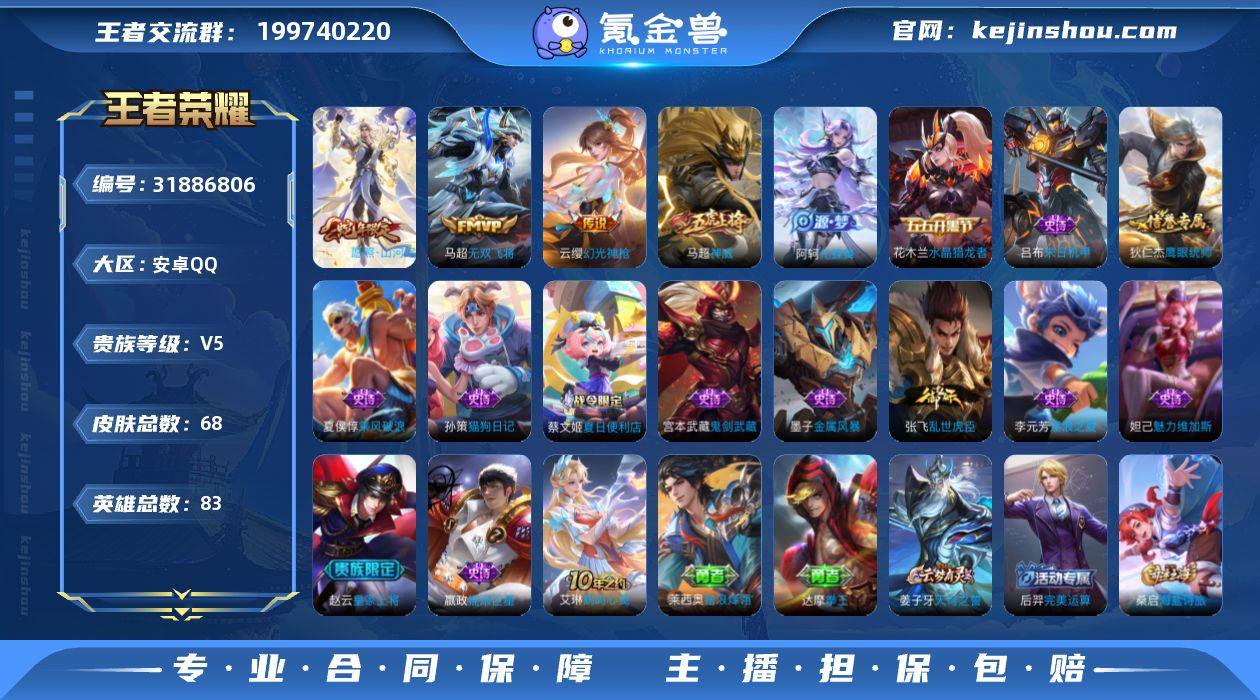 安卓Q-V6-尊贵铂金III段位-发育路45段、金标万战戈娅10038-100英雄-65皮肤-3传说-17史诗【传说皮肤】:镜炽阳神光,孙尚香末日机甲,宫本武藏地狱之眼【限定皮肤】:狄仁杰阴阳师,赵云皇家上将,元歌无心,马可波罗山海玄木吟,狄仁杰魔术师,达摩沙漠行僧,项羽海滩派对,韩信飞衡,兰陵王金庭之子,李元芳云中旅人,鬼谷子五谷丰年,苏烈千军破阵,沈梦溪大漠名商,裴擒虎擒涛扼浪,鲁班大师探海日志,桑启海盐诗旅,张良古海寻踪,蒙恬荣光圣徽,鬼谷子天穹祈灯【年限皮肤】:韩信飞衡,马可波罗山海玄木吟【赛季限定】:苏烈千军破阵,达摩沙漠行僧,兰陵王金庭之子,沈梦溪大漠名商,李元芳云中旅人,桑启海盐诗旅,裴擒虎擒涛扼浪,鲁班大师探海日志,张良古海寻踪,鬼谷子天穹祈灯,蒙恬荣光圣徽【史诗皮肤】:蒙恬荣光圣徽,刘禅电玩爆裂旋风,马可波罗山海玄木吟,元歌无心,鬼谷子五谷丰年,不知火舞魅语,韩信飞衡,娜可露露晚萤,狄仁杰鹰眼统帅,孙策猫狗日记,李元芳逐浪之夏,刘禅天才门将,妲己魅力维加斯,孙尚香水果甜心,狄仁杰魔术师,王昭君偶像歌手,赵云皇家上将【其他皮肤】:艾琳鹤鸣心笺,鬼谷子天穹祈灯,张良古海寻踪,李元芳妄想特派,鲁班大师探海日志,莱西奥西部游侠,太乙真人劲辣红锅,裴擒虎擒涛扼浪,桑启海盐诗旅,戈娅危途狂花,李元芳云中旅人,蒙恬蔚蓝守将,沈梦溪大漠名商,兰陵王金庭之子,达摩沙漠行僧,苏烈千军破阵,姜子牙炽热元素使,吕布野性能量,孙尚香沉稳之力,老夫子功夫老勺,钟无艳海滩丽影,狄仁杰阴阳师,花木兰兔女郎,达摩拳王,亚瑟死亡骑士,扁鹊化身博士,白起白色死神,韩信教廷特使,项羽海滩派对,云缨赤焰之缨,澜孤猎,马超幸存者,曜归虚梦演,元歌午夜歌剧院,裴擒虎街头旋风,公孙离花间舞,百里守约绝影神枪,马可波罗激情绿茵,后羿精...