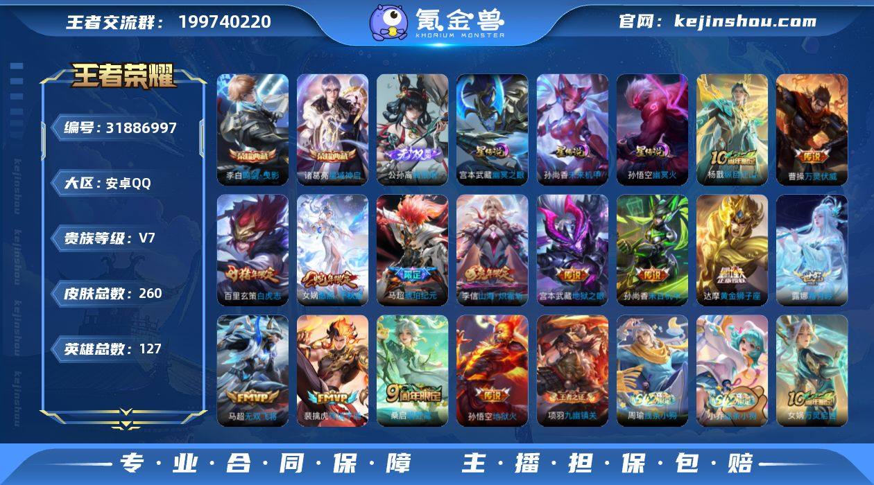 【YX745】贵族7/皮肤260/典藏2/传说16/史诗75/英雄127/金标马超/金标芈月/金标大司命/孙权全皮/敖隐全皮/戈娅全皮/影全皮/鸣剑·曳影/星域神启/离恨烟/幽冥火/幽冥之眼/未来机甲/云缨神骥越千峰/马超神骥逐星野/纵目迁山/万灵伏威/愿照·千秋盛/祥瑞亨通/鸣野蒿/琥珀纪元马超/霜月吟/山海·炽霜斩/无双飞将/黄金狮子座/白虎志/末日机甲-孙尚香/地狱之眼/地狱火/天穹之誓(s36)/破阵·退雄兵/阴阳师/皇家上将/优雅恋人/蔷薇恋人/死亡摇滚/幻夜卜梦/无心/暗影游猎/山海·玄木吟/魔术师/沙漠行僧(s26)/海滩派对/金庭之子(s27)/孙行者/银河之约/云中旅人(s29)/黎明之约/五谷丰年/火炮绅士/原初追遂者/顽趣-梦奇/大漠名商(s28)/李小龙/擒涛扼浪(s31)/电玩高手/纤云弄巧/拒霜思/暖冬·兔眠/玲珑珍味/探海日志(s32)/海盐诗旅(s30)/星界游侠/驭风魔法/流音漫舞/地狱燃心/江河有灵/古海寻踪(s33)/百解令(蒙犽)/蒙恬荣光圣徽/鬼谷子天穹祈灯(S34)/琥珀纪元伽罗/龙武盛年/蔬乡物语(鲁班七号)/蔬乡物语(李元芳)/剑破天穹(s35)/程咬金群星魔术团/青焰无极/苍威无极/芈月浮光幕影/熔金海岸/噬灭天穹(s37)/谧流熔炉/虚灵犬护/逆浪荇歌/荣光之誓/星界战将/九幽镇关/破空之剑/神迹守卫/茶境仙/访茗客/光弋星穹/往忆晖光/线条小狗-周瑜/线条小狗-小乔/万灵启世/龙之律动/雪夜绮愿(周瑜)/电玩·爆裂旋风/永昼/暗渊魔法/月团寄思/热力回旋/晚萤/无限星赏官/鹰眼统帅/星夜王子/功夫厨神/逐浪之夏/舞动绿茵/曙光守护者/特工魅影/心灵骇客/冰冠公主/心灵战警/黄金分割率/暗隐猎兽者/缤纷独角兽/乘风破浪/德古拉伯爵/水晶猎龙者/乱世虎臣/末日机甲-吕布/幽灵船长/金属风暴/女仆咖啡/魅力维加斯/摇滚巨星/水果甜心/鬼剑武藏/地狱岩魂/冰雪圆舞曲/圣诞恋歌/暗夜猫娘/紫霞仙子/苍穹之光/兰陵王雾影缉谜/极光幻客/鹤鸣心笺/径山谋武/小满鸭/命运加冕/布...