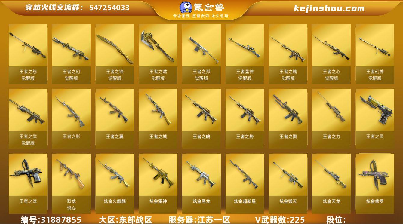 江苏一区-93V-3王者-2炫金 【传说武器】:传说辉光 【热门武器】:传说辉光,QBZ03-金色蔷薇,Scar Light-白虎,HK417-朱雀,M200-幻神*2,死亡之眼*3,Kar98K-星神,M4A1-黑骑士,汤姆逊-烈龙*7,RPK-盘龙*3,加特林-炼狱*4,斯泰尔-蝴蝶,降世魔童,USP-雷暴,COP-堕天神,沙鹰-修罗*8,黄金猫猫手套-白鲨,金刚伞 【王者炫金武器】:炫金骑士,炫金天神 【音效卡】:M200-幻神音效卡,AK47-火麒麟音效卡,M4A1-雷神音效卡,M4A1-黑龙音效卡,M4A1-黑骑士音效卡,Barrett-毁灭音效卡,Barrett-极光音效卡,Scar Light-白虎音效卡,70KG语音包 【皮肤】:幻神-AG-CFPLS17冠军,幻神-宠儿-2021MVP,幻神-CFS2022,M200-幻神-荣耀世冠白鲨,白虎-电玩粉兔皮肤,QBZ03-AG-CFPLS19冠军,星神-枪娘默 皮肤,雷神-暗月,雷神-耀金皮肤,雷神-荣耀世冠AG,雷神-机甲刑天皮肤,雷神-宇航兔皮肤,火麒麟-华夏之心,火麒麟-轻羽皮肤,火麒麟-战神关羽,火麒麟-百城,火麒麟-巅峰荣耀,毁灭耀金皮肤,毁灭-星空,毁灭-黑大圣皮肤,毁灭-神秘黑洞皮肤,M4A1-千变-孔明皮肤,黑龙-能量核心,黑龙-暗月,战神-粉色甜心皮肤,AK47-B-常胜将军-刘备*2,AWM-天龙-传奇70KG,极光-能量核心,炼狱-玩具枪皮肤,修罗-星空,屠龙-荣耀之锋,麒麟刺-萌杀皮肤 【角色】:零,葵,鹰,王者-瞳-闭月羞花,乔伊教练,云海玲珑,炽天使,空,初恋灵狐,芳心审判者,风暴女,嘉年华灵狐,零-水下丽影,灵狐者-X,灵狐者-七夕宝贝,灵狐者-职业经理,龙儿-小淘气,曼陀罗-礼服,萌儿,潘多拉-X,潘多拉-甜心教官,青霞仙子,铁骑荣耀,兔囡囡,雪莉杨-摸金校尉,夜玫瑰-幻能朋克,樱-青春偶像,樱-战斗天使,影武者-X,职业选手 【人偶武器】:M4A1-雷神-精英刀锋,斯泰尔-蝴蝶,Barrett-战龙-灵狐者,M37-葵,COP-旗袍,夺魂,迷你超能女侍,...