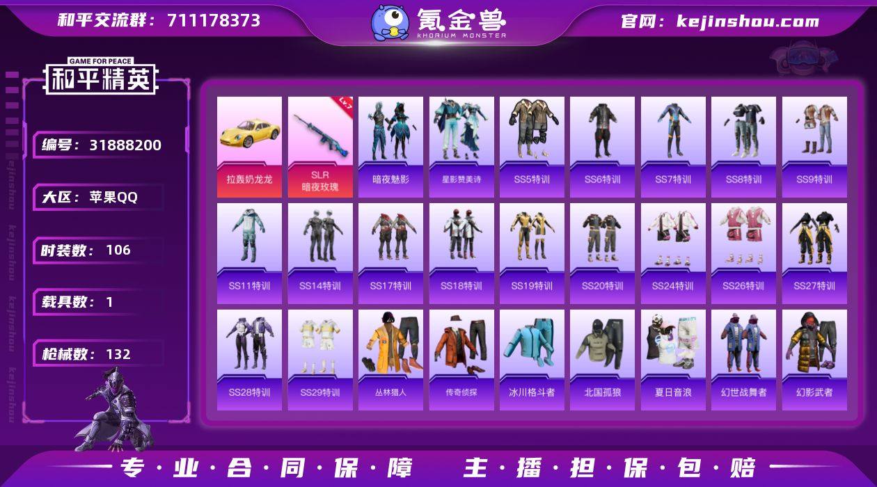 106套装/枪械1/装备141/载具1/战备99/热力值42769/七级SLR-暗夜玫瑰/拉轰奶龙龙/僚机-萌兔起飞/僚机-萌酷奶龙/SLR暗夜玫瑰/春暖花开降落伞/天启纪元降落伞/神秘黑猫降落伞/暗夜玫瑰降落伞/莲影清波降落伞/月影灵韵降落伞/星影赞美诗/AKM-夜灯/AKM-天启纪元/AKM-破晓战魂/AKM-萝萝小趴兔/AKM-虎虎生威/AKM-霓虹街区/M16A4-幻世战舞者/SCAR-L-炫彩节奏/SCAR-L-玉兔迎春/SCAR-L-红色方程式/M416-糯团青竹/M416-红色方程式/M416-绯红前夜/M416-蓝色火焰/GROZA-懵萌河马/GROZA-黑色刀锋/AUG-耀粉歌者/QBZ-彩虹符号/QBZ-银河战甲/M762-天降萌叽/M762-拳皇97/M762-牛气冲天/M762-瑞龙福将/G36C-懵萌河马/G36C-暗夜玫瑰/AC-VAL-快闪甜心/蜜獾-天降萌叽/UZI-众神之王/UZI-啾咪啾咪/UZI-炫彩节奏/UZI-红色方程式/UZI-金风玉露/UMP45-春暖花开/UMP45-生命誓言/Vector-彩虹符号/Vector-暗夜玫瑰/Vector-黑色刀锋/汤姆逊-勇闯险境/汤姆逊-耀粉歌者/MP5K-众神之王/P90-快闪甜心/Kar98K-勇闯险境/Kar98K-梦幻火箭/Kar98K-红色方程式/M24-冰封烈焰/SKS-勇闯险境/SKS-炫彩节奏/VSS-黑色刀锋/Mini14-春暖花开/Mini14-耀粉歌者/Mk14-猪猪侠/Win94-瑞龙福将/SLR-众神之王/莫辛纳甘-懵萌河马/MK20-H-快闪甜心/MK20-H-莲影清波/S686-冰封烈焰/S686-生命誓言/S1897-勇闯险境/S1897-天启纪元/S12K-瑞龙福将/S12K-华贵君王/M249-拳皇97/M249-破晓战魂/M249-莲影清波/DP-28-彩虹符号/MG3-幻世战舞者/MG3-瑞龙福将/PKM-懵萌河马/P92-拳皇97/P92-雷霆特警/P1911-冰封烈焰/沙漠之鹰-快闪甜心/沙漠之鹰-旋转彩虹/爆炸猎弓-天星战神/SS5特训/SS6特训/SS7特训/SS8特训/SS9特训/SS11特训/SS14特训/SS17特训/SS18特训/SS19特训/SS20特训/SS24特训/SS26特训/SS27特训/SS28特训/SS29特训/