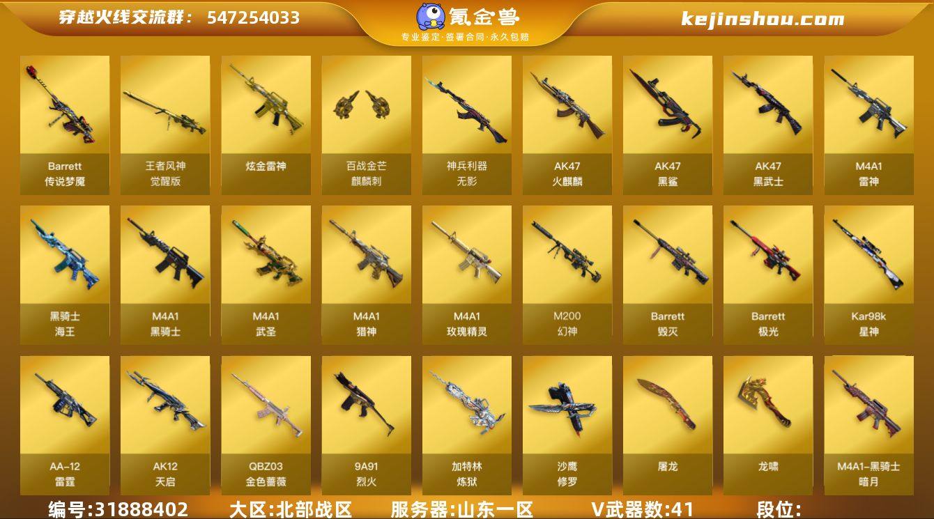 41V/102级/荣耀元首/1传说/1王者/1炫金/雷神三件套/毁灭三件套/传说梦魇/QBZ03-金色蔷薇/M200-幻神/Kar98k-星神/M4A1-黑骑士/加特林-炼狱/沙鹰-修罗/炫金雷神/M4A1-雷神音效卡/Barrett-毁灭音效卡/幻神-宠儿/M200-幻神-N9-2022MVP/雷神-耀金皮肤/雷神-宠儿-2019MVP/M4A1-再燃火线/火麒麟-巅峰荣耀/毁灭耀金皮肤/黑骑士-暗月/无影耀金皮肤/天启-暗月/轻型军用手斧-再燃火线/乔伊教练/修道士/葵-阿尔法武装/暗夜-X/风暴女/嘉年华灵狐/娟娟/灵狐者-X/灵狐者-黄金海岸/麻雀/娜塔莉娅/潘多拉-X/潜龙队-X/青霞仙子/斯沃特-X/铁骑荣耀/影武者-X/AWM-灵狐-15周年嘉年华/迷你牛魔王/迷你波特博士/夺魂/迷你牛牛/深渊终结者手雷/超级对讲机/激光毁灭者III-白马银枪/激光毁灭者/神圣爆裂者-末日/AK47-火麒麟/M4A1-雷神/AK47-黑武士/AK12-天启/M4A1-武圣/AK47-黑鲨/无影-神兵利器/M4A1-玫瑰精灵/M4A1-猎神/9A91-烈火/黑骑士-海王/Barrett-毁灭/Barrett-极光/王者风神-觉醒版/AA-12-雷霆/屠龙/龙啸/麒麟刺-百战金芒/高爆手雷-幻灵/闪光弹-幻灵/BS战队炫彩背包/云山科技背包/全能枪王背包/炫彩背包/百战金芒炫彩背包/女皇终结者-魔龙之吻/救世主-黑桃战神/绿色巨人/灵魂忍者/迷雾幽灵/夺命之镰/防化服/金色流光-枪王排位/星辰流光-枪王排位/流光-鎏金之域/萌萌小葵表情/防弹头盔/防弹衣/C4工具钳/手雷包
