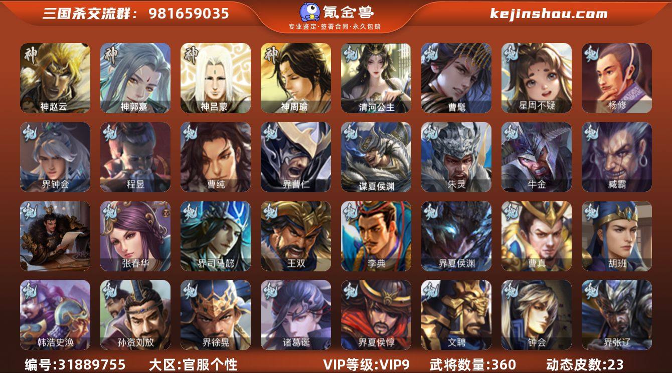 VIP等级: VIP9 官阶: 大将军 武将数量: 360 动态皮肤数量: 23 神将: 神郭嘉,神赵云,神吕蒙,神周瑜 魏国武将: 曹纯,程昱,界钟会,杨修,徐庶,张辽,SP蔡文姬,SP关羽,SP贾诩,SP姜维,SP庞德,卞夫人,蔡贞姬,曹昂,曹操,曹冲,曹洪,曹丕,曹仁,曹叡,王异,张恭,鲁芝,界满宠,曹休,界曹植,满宠,荀攸,王基,钟繇,蒯越蒯良,郭嘉,荀彧,阮慧,杜畿,界郭嘉,崔琰,界曹丕,界荀彧,朱灵,界甄姬,吕虔,界王异,界许褚,界郭淮,华歆,陈群,界邓艾,界典韦,界曹休,袁涣,李通,乐进,辛宪英,郭淮,毛玠,郭皇后,毌丘俭,夏侯惇,曹植,司马朗,谋于禁,界曹操,星周不疑,许褚,界张辽,谋徐晃,张郃,钟会,文聘,曹彰,界夏侯惇,诸葛诞,司马懿,甄姬,界徐晃,徐晃,界曹仁,孙资刘放,韩浩史涣,胡班,曹真,典韦,界夏侯渊,夏侯渊,李典,于禁,王双,邓艾,界司马懿,张春华,孟达-魏,臧霸,牛金,朱灵(国战),曹髦,清河公主,谋夏侯渊 蜀国武将: 花鬘,界黄忠,谯周,谋马超,谋赵云,徐庶,界魏延,杨仪,界关羽,界诸葛亮,邓芝,界伊籍,胡金定,费祎,严颜,界黄月英,赵云,张松,彭羕,李丰,界刘备,界刘禅,谋姜维,刘封,糜竺,谋庞统,黄月英,关羽,王甫赵累,吴懿,祝融,张飞,黄皓,魏延,界周仓,马忠,界法正,糜夫人,界孟获,刘禅,界赵云,界姜维,张翼,关银屏,界祝融,SP孙尚香,SP徐庶,卧龙诸葛,宗预,周仓,简雍,界关兴张苞,诸葛亮,孙乾,界张飞,界卧龙诸葛,法正,界简雍,赵统赵广,陈到,界马岱,关平,马岱,界庞统,庞统,诸葛果,谋张飞,马谡,马超,廖化,关兴张苞,孟获,夏侯氏,姜维,黄忠,刘备,界马超,李严,马良,傅肜,蒋琬费祎,刘谌,蜀-孟达,彭羕(国战),甘夫人,SP甘夫人 吴国武将: 界朱然,潘濬,周泰,全琮,吕蒙,诸葛恪,界孙尚香,界顾雍,大乔小乔,桥公,谋周瑜,界程普,许贡,丁奉,谋吕蒙,周鲂,界全琮,孙茹,蒋钦,顾雍,阚泽,孙亮,界朱治,孙休,严畯,界孙权,孙翊,界凌统,祖茂,濮阳兴,界虞翻,界吕蒙,陈武董袭,孙登,界孙策,凌操,朱...