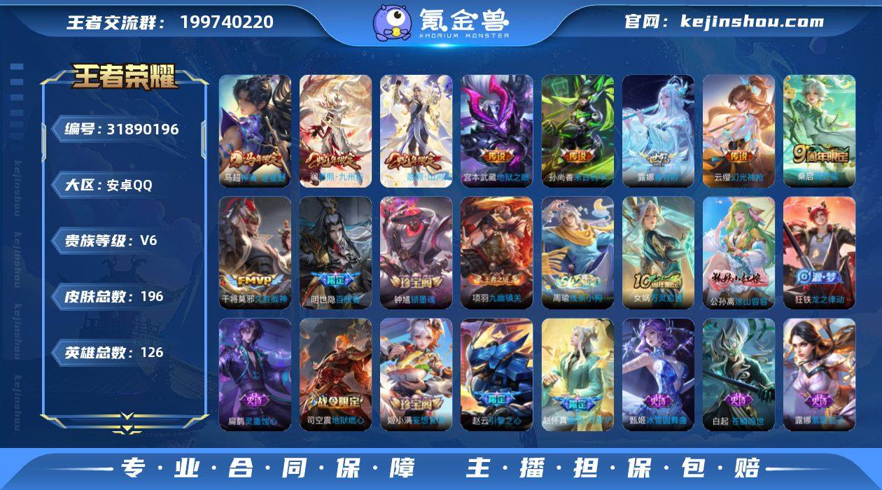 贵族7/皮肤170/典藏1/传说7/史诗47/英雄126/鸣剑·曳影/后羿神树通天/炽阳神光/武圣/一念神魔/久胜战神/白虎志/地狱之眼/狰(s8)/埋骨钱/蔡文姬夏日便利店/阴阳师/皇家上将/白昼王子/狮舞东方/玩趣恶龙/迷踪丽影/猎兽之王/赤莲之焰/朔风刀(s17)/暗影游猎/魔术师/万华元夜(s22)/海滩派对/醍醐杖(s20)/夺宝奇兵/驯魔猎人/至尊宝/御旌(s15)/虎魄/神迹守卫-钟馗/单词大作战/繁星吟游/原初探秘者(s21)/青龙志/朱雀志/混沌棋(s18)/疑决卦(s19)/李小龙/御霄(s14)/纤云弄巧/御銮(s16)/西部大镖客-猪八戒/梁祝/天狼绘梦者/狂想玩偶喵/探海日志(s32)/地狱燃心/古海寻踪(s33)/鬼谷子天穹祈灯(S34)/龙武盛年/剑破天穹(s35)/程咬金群星魔术团/熔金海岸/圣诞恋歌/冰雪圆舞曲/偶像歌手/鬼剑武藏/水果甜心/摇滚巨星/魅力维加斯/女仆咖啡/金属风暴/圣诞狂欢/幽灵船长/千年之狐/末日机甲-吕布/乘风破浪/缤纷独角兽/舞动绿茵/逐浪之夏/星夜王子/节奏热浪/鹰眼统帅/修罗/时之恋人-孙尚香/龙之律动/百相守梦-黄忠/涂山容容/莱西奥光弋星穹/女娲万灵启世/教廷特使/街头霸王/白执事/忍·炎影/白色死神/化身博士/救世之瞳/未来纪元-宫本武藏/少女阿狸/黄金武士/死亡骑士/拳王/兔女郎/五福同心/花好人间/万象初新/阿尔法小队/纽约教父/汉昭烈帝/龙腾万里/海滩丽影/幻想奇妙夜/命运角斗场/功夫老勺/掌控之力/幻乐之宴/坚韧之力/守护之力/丁香结/野性能量/神迹守卫/归虚梦演-蒙犽/鲨炮海盗猫/次元突破/圆桌骑士(盾山)/无尽征程/秘密基地/次元傲视/瓷语鉴心/乓乓大师/西部游侠/星梦巡礼/虚灵犬护/布丁狗之约/逆浪荇歌/踏浪烽翎/克喵/罗小黑战记/亚瑟荣光之誓/明世隐往忆晖光/艾琳鹤鸣心笺/福禄兄弟/异域舞娘/剑舞者/潮流仙人/精灵公主/死神来了/超能战警/一千零一夜/万圣前夜/未来旅行/海军大将/精灵王/英喵野望/隐刃/战争女神/激情绿茵/三太子/...