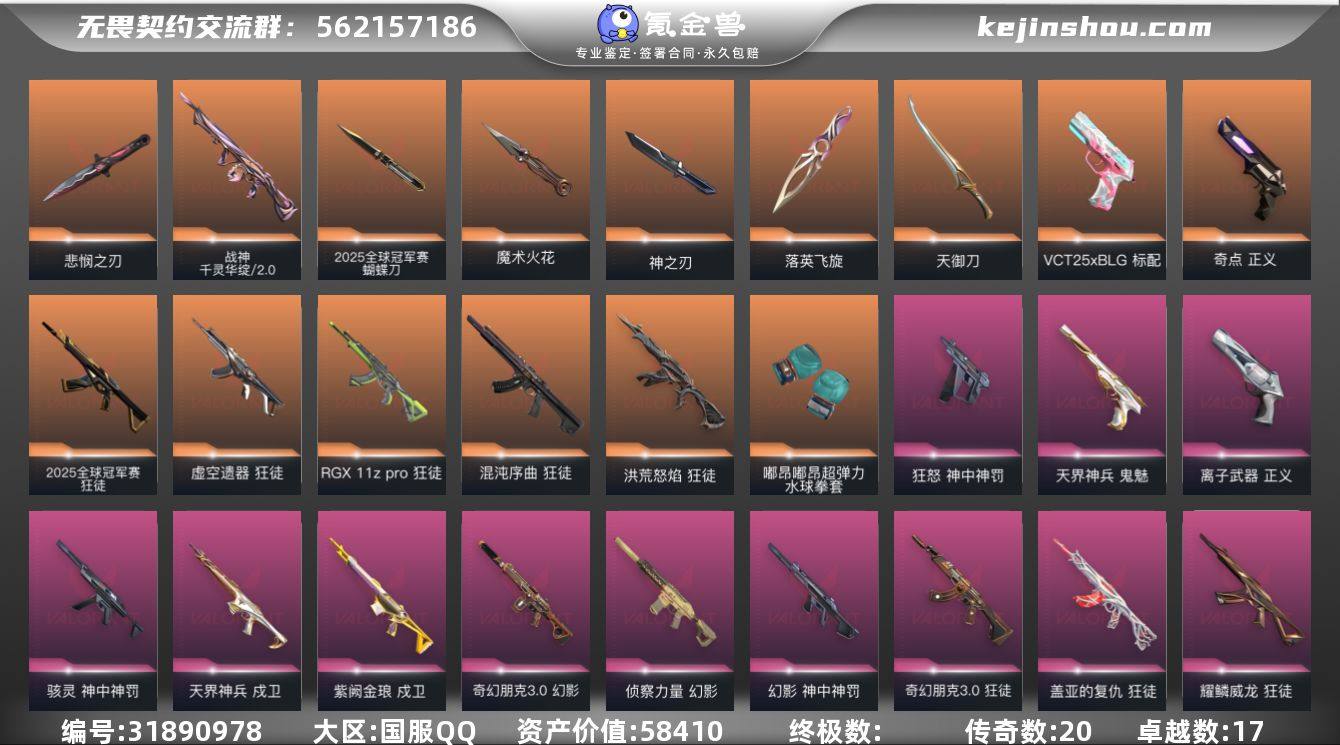 【自带包赔 可赔三倍】:库存价值58410 极品少萝女号 性价比超值库存图 【限定】: 无畏契约季前邀请赛 悲悯之刃, 2025全球冠军赛 狂徒, 2025全球冠军赛 蝴蝶刀 【近战】: 天御刀, 无畏契约季前邀请赛 悲悯之刃, 嘟昂嘟昂超弹力水球拳套, 2025全球冠军赛 蝴蝶刀, 魔术火花, 落英飞旋, 神之刃 【狂徒】: 盖亚的复仇 狂徒, 2025全球冠军赛 狂徒, 奇幻朋克//3.0 狂徒, 堕天遗武 狂徒, 混沌序曲 狂徒, 紫阙金琅 狂徒, 洪荒怒焰 狂徒, RGX 11z Pro 狂徒, 虚空遗器 狂徒, 耀鳞威龙 狂徒 【幻影】: 奇幻朋克//3.0 幻影, 侦察力量 幻影, 神中神罚 幻影 【冥驹】: 堕天遗武 冥驹 【正义】: 奇点 正义, 离子武器 正义 【戍卫】: 天界神兵 戍卫, 紫阙金琅 戍卫 【鬼魅】: 天界神兵 鬼魅 【骇灵】: 神中神罚 骇灵 【标配】: VCT25 x BLG 标配 【狂怒】: 神中神罚 狂怒 【战神】: 千灵华绽//2.0 战神 【莽侠】: 神中神罚 莽侠 【概要】: 总皮肤 105 终极 0 传奇 20 卓越 17 刀皮 英雄 28 LV 184 历史最高:超凡 当前段位:超凡一 已使用 1190 R点 剩余 60 R点 可二次 卡面、挂饰、其他皮肤请看截图 道具、段位等以实际验号为准。如账号因没有维护,赛季更新等不可抗因素发生变化,不属于账号质量问题"