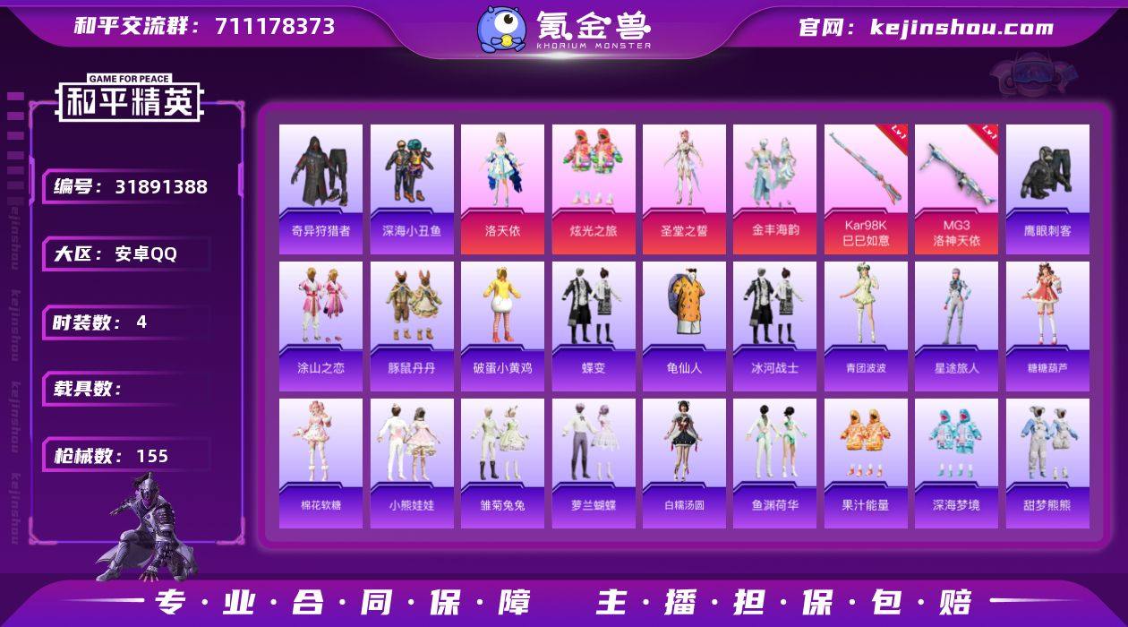 M1046601【素材号4粉装-5特效枪 深海小丑鱼,奇异狩猎者】安卓手Q-4粉装-5特效枪-112套装-155枪皮-7王牌印记-坚韧铂金Ⅳ-48377热力值【4粉装】炫光之旅,金丰海韵,角色-圣堂之誓,角色-洛天依【5特效枪】DP-28-豹影疾电[5级],Kar98K-巳巳如意[4级],MG3-洛神天依[7级],AMR-炫光之旅[7级],蜜獾-异瞳寒姬[5级]【5稀有】深海小丑鱼,奇异狩猎者,M762-奇异狩猎者,汤姆逊-奇异狩猎者,S686-奇异狩猎者【4飞行器】顶峰精英尾迹,繁龙极客飞行器,空岛之星尾迹,粉色滑翔尾迹【1背包】银河战甲背包【253其它衣服和枪皮】破蛋小黄鸡,耀粉歌者,天籁歌者,活力之心,冰冻风暴,锦衣飞扬,魅力单车,霓虹街区,冰河战士,创世·幻影,幽夜迷踪,星途旅人,绯格组合,雏菊兔兔,朱霞炽焰,云霞荷露,热情海星,SS32特训,热血青春,玩偶服-卖崽青蛙,人气偶像,香桃花海,蓝调潮人,SS29特训,SS36特训,贵族骑装,王牌教练,光之冒险,惊鸿侠骨,特训学院,柠萌假日,妙红点点,果汁能量,海盐绵绵冰,金戈铁马,老实芭蕉,春光漫游,幻世战舞者,贝斯之夜,荣耀,鹰眼刺客,幻彩翩翩,街头风暴,深海梦境,角色-时希公主,快闪甜心,SS34特训,龙的传人,幻世保卫者,SS30特训,长空猛禽,冷焰舞者,SS25特训,SS26特训,SS24特训,SS31特训,甜梦熊熊,快乐星愿,擎苍青焰,竞技名士,蝶变,棉花软糖,小熊娃娃,龙魂突击队,龟仙人,神气柴柴,豚鼠丹丹,空岛之星,焰鹰斗篷,漫步者,懵萌河马,角色-俏兔智灵,青玉碎影,角色-情公主,海岛探路者,青涩时光,元素星魂,电音精灵,纯真浪花,SS28特训,青年教官,明鸳圣池,幻羽潜行,SS35特训,疯狂小兔子,SS27特训,涂山之恋,黑色伏地魔,SS23特训,白糯汤圆,战术大师,千禧之恋,鱼渊荷华,曼妙人鱼,蓝色运动,糖糖葫芦,萝兰蝴蝶,凌霄紫焰,旭日情侣,薄荷星砂,萌鸡速递,坚韧舞者,青团波波,金耀舞者,元气之梦,竞技角斗士,20-H-星途旅人,铝热弹-炫彩糖果,十字弩-异瞳寒姬,UZI