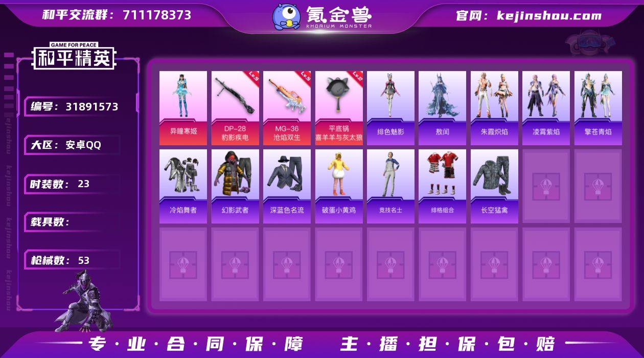 安卓手Q H-QWD047【1粉装3特效枪1粉色飞行器 异瞳寒姬/敖闰/绯色魅影】11846热力值-2王牌印记-23套装-53枪皮 【粉色套装】:角色-异瞳寒姬 【粉色枪皮等级】:DP-28-豹影疾电(五级),MG-36-沧焰双生(五级),平底锅-喜羊羊与灰太狼(二级) 【粉色枪皮】:DP-28-豹影疾电,MG-36-沧焰双生,平底锅-喜羊羊与灰太狼 【粉色飞行器】:炫彩糖果飞行器 【粉色降落伞】:喜羊羊与灰太狼降落伞,炫彩糖果降落伞 【稀有套装】:套装-炫彩糖果,套装-朱霞炽焰,套装-凌霄紫焰,套装-擎