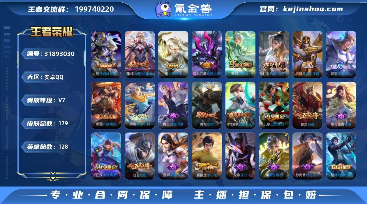 V7【9传说 15皮肤按键 贵族积分29988】安卓微信/非凡王者/169皮肤/125英雄/9传说/32史诗/7稀有英雄 【9 传说皮肤】齐天大圣 孙悟空,遇见神鼓 吕布,无限倾心 项羽,怒海麟威 吕布,山海·炽霜斩 李信,一念神魔 李信,百相守梦 张飞,神树通天 后羿,鸣野蒿 桑启, 【32 史诗皮肤】龙鼓争鸣 蒙犽,电玩小子 鲁班七号,末日机甲 吕布,高山流水 庄周,妄想食味 姬小满,心灵战警 亚瑟,五谷丰年 鬼谷子,鬼剑武藏 宫本武藏,百相守梦 关羽,魅力维加斯 妲己,黄金分割率 诸葛亮,女仆咖啡 妲己,星界游侠 暃,猪悟能 猪八戒,鹰眼统帅 狄仁杰,金属风暴 墨子,特工魅影 百里守约,猫狗日记 孙策,魔术师 狄仁杰,皇家上将 赵云,天才门将 刘禅,圣诞恋歌 貂蝉,水晶猎龙者 花木兰,圣诞狂欢 吕布,罗小黑战记 百里玄策,百相守梦 刘备,蔷薇恋人 孙尚香,冰雪圆舞曲 甄姬,匿光破解者 沈梦溪,绅士熊喵 刘禅,水果甜心 孙尚香,乘风破浪 夏侯惇, 【86 勇者皮肤】爱心护理 阿轲,太极少年 赵怀真,沙漠行僧 达摩,大漠名商 沈梦溪,缤纷绘卷 张良,纽约教父 刘备,龙舞盛年 沈梦溪,乐园追猎者 白起,丁香结 小乔,功夫炙烤 廉颇,沉稳之力 孙尚香,海盐诗旅 桑启,归虚梦演 孙膑,汉昭烈帝 刘备,热血海滩 哪吒,白色死神 白起,黄金武士 典韦,阴阳师 狄仁杰,次元突破 哪吒,古海寻踪 张良,牛运亨通 牛魔,功夫老勺 老夫子,鲨炮海盗猫 沈梦溪,海滩派对 项羽,完美运算 后羿,踏浪烽翎 莱西奥,演武夺筹 程咬金,红桃皇后 芈月,守护之力 大乔,无双福将 程咬金,原初探秘者 鬼谷子,潮玩探月行 猪八戒,天穹祈灯 鬼谷子,五福同心 张飞,幻乐之宴 鬼谷子,东方不败 武则天,虹云星官 明世隐,死亡骑士 亚瑟,玩偶对对碰 安琪拉,掌控之力 诸葛亮,海滩丽影 钟无艳,忍·炎影 赵云,雪境奇遇 西施,唤灵魔甲 刘禅,擒涛扼浪 裴擒虎,乓乓大师 鲁班大师,探海日志 鲁班大师,天使之翼 孙膑,兔女郎 花木兰,...