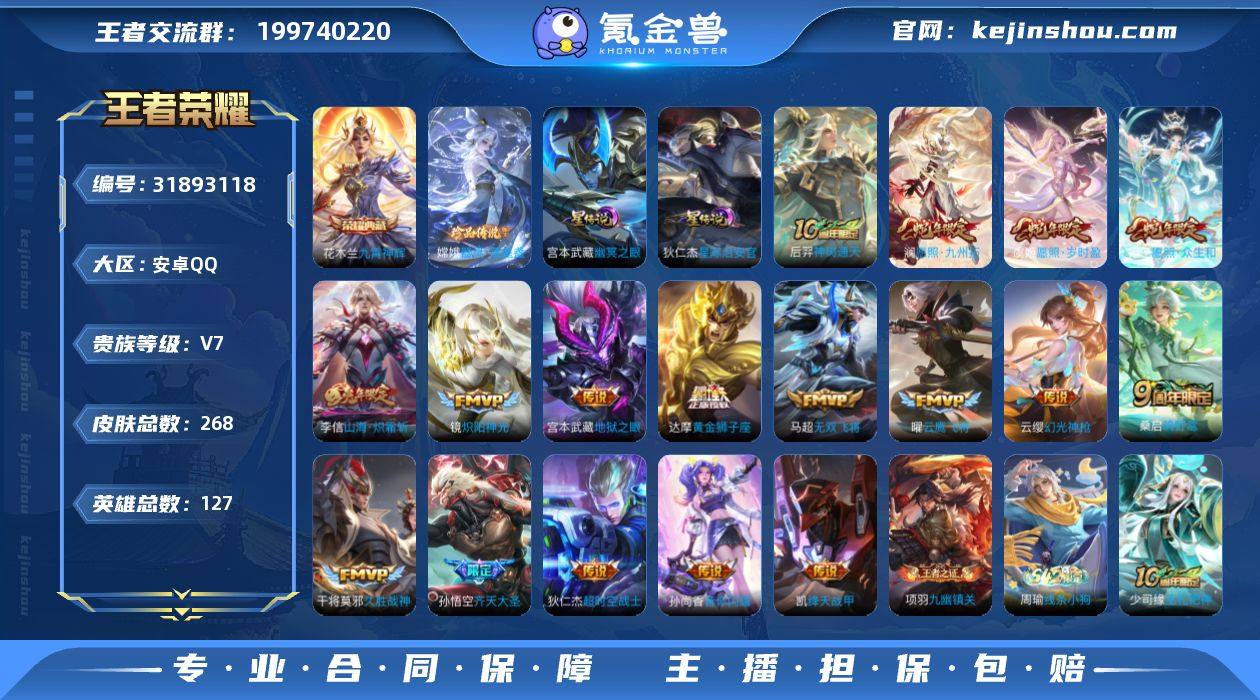 账号亮点:花木兰九霄神辉 嫦娥器灵落星盏 后羿神树通天,妲己愿照众生和,澜愿照九州拓,虞姬愿照岁时盈,云缨幻光神枪,桑启鸣野蒿,孙悟空齐天大圣,李信山海炽霜斩,孙尚香音你闪耀,马超无双飞将,铠绛天战甲,镜炽阳神光,曜云鹰飞将,干将莫邪久胜战神,达摩黄金狮子座,宫本武藏地狱之眼,狄仁杰超时空战士539 【英雄全皮】:赵怀真全皮 【荣耀典藏】:花木兰九霄神辉 【珍品传说】:嫦娥器灵落星盏 【传说皮肤】:后羿神树通天,妲己愿照众生和,澜愿照九州拓,虞姬愿照岁时盈,云缨幻光神枪,桑启鸣野蒿,孙悟空齐天大圣,李信山海炽霜斩,孙尚香音你闪耀,马超无双飞将,铠绛天战甲,镜炽阳神光,曜云鹰飞将,干将莫邪久胜战神,达摩黄金狮子座,宫本武藏地狱之眼,狄仁杰超时空战士 【限定皮肤】:蒙犽顽岩魄,姜子牙天穹之誓,杨戬破阵退雄兵,狄仁杰阴阳师,赵云皇家上将,鲁班七号乒乒小将,扁鹊奇幻香踪,元歌云间偶戏,马可波罗暗影游猎,狄仁杰魔术师,达摩沙漠行僧,项羽海滩派对,孙悟空至尊宝,孙悟空齐天大圣,李元芳匿光侦查者,李元芳云中旅人,钟馗神迹守卫,杨玉环遇见飞天,杨戬潮玩骑兵,干将莫邪胡桃夹子,雅典娜黎明之约,蔡文姬繁星吟游,沈梦溪大漠名商,沈梦溪匿光破解者,裴擒虎擒涛扼浪,米莱狄胡桃异想国,李信山海炽霜斩,嫦娥暖冬兔眠,西施玲珑珍味,鲁班大师探海日志,桑启海盐诗旅,暃星界游侠,戈娅驭风魔法,艾琳流音漫舞,赵怀真鹤归松栖,司空震地狱燃心,阿古朵江河有灵,张良古海寻踪,高渐离燃音魔法,妲己灵卜魔法,鬼谷子天穹祈灯,沈梦溪龙舞盛年,刘邦剑破天穹,程咬金群星魔术团,镜青焰无极,项羽苍威无极,刘备异域游侠,周瑜熔金海岸 【年限皮肤】:李信山海炽霜斩,妲己愿照众生和,澜愿照九州拓,虞姬愿照岁时盈 【赛季限定】:达摩沙漠行僧,沈梦溪大...
