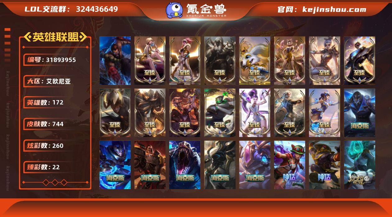 未定级段位-172英雄-744皮肤-260炫彩-1终极-25神话-122限定-64传说-186史诗【神话皮肤】:十周年纪念安妮,源代码乐芙兰,十五周年纪念希维尔,新卧虎藏龙贾克斯,神凰行者瑞羽圣凰艾尼维亚,海克斯科技嘉文四世,海克斯科技卡萨丁,海克斯科技克格莫,海克斯科技雷克顿,恐惧新星德莱厄斯,零之枪骑赫卡里姆,至臻征服者贾克斯,至臻黑夜使者凯隐,至臻黑夜使者李青,至臻KDA阿卡丽,至臻KDA阿狸,至臻KDAALLOUT卡莎,至臻KDA伊芙琳,至臻烈焰美人薇恩,至臻青花瓷拉克丝,至臻绒毛菲兹,至臻王国机神玄武盖伦,至臻未来战士锤石,至臻腥红之月亚托克斯,至臻玉剑传说武剑仙【热门头像】:爱情之歌头像,战斗学院拉克丝头像【至臻皮肤】:至臻征服者贾克斯,至臻KDA伊芙琳,至臻黑夜使者李青,至臻烈焰美人薇恩,至臻KDA阿卡丽,至臻王国机神玄武盖伦,至臻玉剑传说武剑仙锐雯,至臻青花瓷拉克丝,至臻KDA阿狸,至臻绒毛菲兹,至臻黑夜使者凯隐,至臻KDAALLOUT卡莎,至臻腥红之月亚托克斯,至臻未来战士锤石【臻彩皮肤】:天龙之子卡莎飞龙乘云,无畏骑士瑟庄妮赤子初心,替父从军花木兰炫金龙刃,张辽文远炫金将军,冰霜之刃艾瑞莉娅炫金,冰雪节格雷福斯炫金,赵云子龙炫金将军,墨之影武者亚索金墨耀影,冠军掠夺者卡兹克凯旋圣装,弹幕天使卡莎炽天使勇敢,源计划毁灭派克幻灭,玉剑传说翼剑仙珠光,霸天巨兽雪崩墨菲特,霸天剑魔亚托克斯涤罪之翼,最终BOSS维迦里大魔王,幻灵战斗队长厄运小姐勇气赞歌,魔女阿卡丽虚荣,净雪之月莫甘娜冬虹,幻灵战斗兔阿萝拉梦幻强袭,西部魔影执行人卡特琳娜纯洁,北极星钢影卡蜜尔智慧纽带,心之钢伊泽瑞尔天纵才华【年限皮肤】:龙的传人李青,定海神珍孙悟空,醒狮克格莫,你看见过我的熊猫吗安妮,替父从军花木兰,神龙烈焰金克丝,美猴王孙悟空,张辽文远,北辰之威...