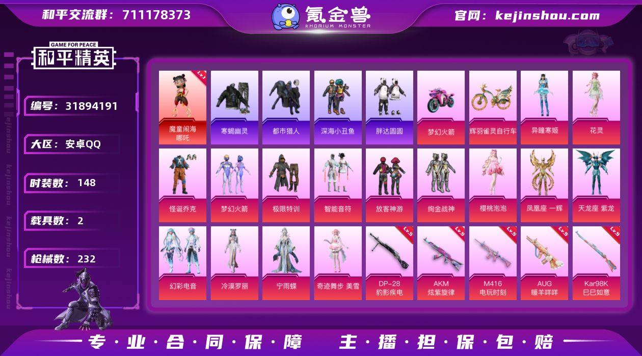 安卓手Q-15王牌印记-17粉装-14特效枪-7载具-热力值-204套装-299枪皮-3卓越印记-2传奇印记 【17粉装】,梦幻火箭,零号机款机体服,初号机 觉醒Ver.,2号机款机体服,新星烈龙,洛天依,幻彩电音,奇迹舞步 美雪,光极星,恐龙拽拽,幻影飞狐,小可学妹,美雪,紫电风暴,碧穹智者,金丰海韵,数码大师 【14特效枪】AKM-白勺歌姬-4级 AKM-炫紫旋律-3级 SCAR-L-锦绣绵绵-5级 SCAR-L-青春物语-5级 M416-墨龙九天-1级 M416-心之恋语-1级 M416-灵猫魔法师-8级 M762-电糖天使-4级 Kar98K-巳巳如意-5级 MK12-雪月幻音-2级 P90-沙丘之主-3级 Vector-最终圣卫者-3级 DP-28-豹影疾电-5级 MG3-洛神天依-5级 【1红装】,幽焰骑士-维塔/2级, 【15稀有紫装】,Mark.06,8号机,萌熊伴侣背包(3级),暗影哥特,浪漫天命,雪山精英,胖达团团,明日香款战斗服,小丑鱼,龟仙人,怀庆长公主,萌熊伴侣背包(2级),零款战斗服,真理款战斗服,真嗣款战斗服, 【7稀有载具】,最终圣卫者摩托车,黑曜夜骑,宾利飞驰(布罗德盖棕双色),布加迪威龙(律动橙),合金龙骨(蓝),星梦玉骢,疾风龙骑, 【204稀有时装】,维塔/2级,SS35特训,SS31特训,SS33特训,SS32特训,蓝冰羽,雪绒豹,恋语绒绒,星渊小夜曲,SS34特训,紫幽梦,大橘大利,喜羊羊,胖达团团,浪漫天命,龟仙人,Mark.06,雪山精英,暗影哥特,小丑鱼,8号机,零款战斗服,明日香款战斗服,真理款战斗服,怀庆长公主,真嗣款战斗服,薄荷星砂,蓝海鲸歌,云朵鹅,引力深渊,神气赞萌露比,激萌罗小黑,狂沙舞者,粉雾星云,龙魂突击队,卖崽青蛙,小熊娃娃,都市丽猫,摩登魅猫,绒宝小鹅,街头风暴,星途旅人,冰河战士,鱼渊荷华,SS30特训,创世·追猎,青团波波,燕燕于飞,战术大师,智谋强哥,雏菊兔兔,糖糖葫芦,晶辉守护,香桃花海,米开朗基罗,蝶变,巳巳如意,曼妙人鱼,棉花软糖,极地流光,SS28特训,白光莹,SS
