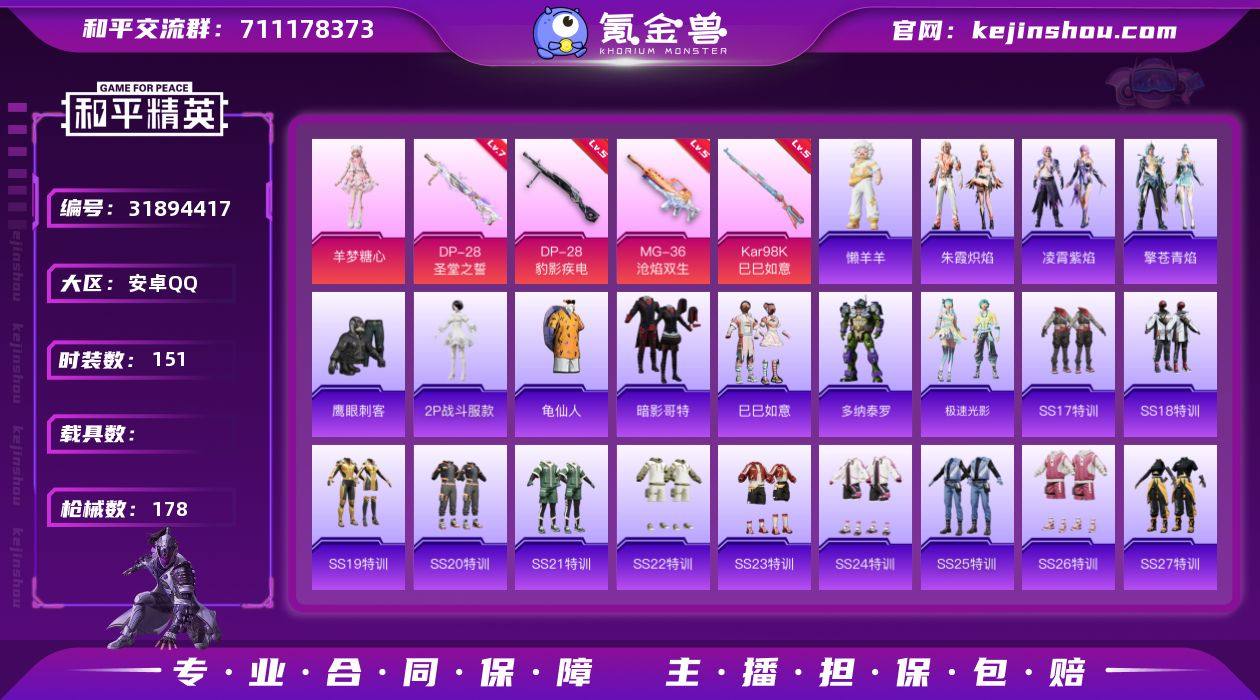 无二次-安卓 手Q-1粉装-6特效枪-0载具-2粉色飞行器-51221热力值-15王牌印记-151套装-178枪皮 【热门品类】:角色-2P战斗服款,套装-龟仙人,套装-暗影哥特 【粉色套装】:角色-羊梦糖心 【粉色枪皮等级】:ACE32-萌骑漫游(五级),Kar98K-巳巳如意(五级),Mk14-福马献瑞(五级),DP-28-圣堂之誓(七级),DP-28-豹影疾电(五级),MG-36-沧焰双生(五级) 【粉色枪皮】:ACE32-萌骑漫游,Kar98K-巳巳如意,Mk14-福马献瑞,DP-28-圣堂之誓,DP-28-豹影疾电,MG-36-沧焰双生 【粉色飞行器】:炫彩糖果飞行器,极意拳锋飞行器 【粉色降落伞】:炙焰牛王降落伞,垂柳戏鸭降落伞,太空嘟嘟降落伞,繁龙极客降落伞,幻彩电音降落伞,绯穹魔姬降落伞,异瞳寒姬降落伞 【稀有套装】:套装-龟仙人,套装-巳巳如意,套装-雪国风尚,套装-马上有钱,角色-多纳泰罗,套装-极速光影,套装-朱霞炽焰,套装-凌霄紫焰,套装-擎苍青焰,玩偶服-懒羊羊,套装-红釉青花,角色-唐三 【稀有枪皮】:AKM-夜灯,AKM-彩虹符号,AKM-破晓战魂,AKM-虎虎生威,AKM-龙的传人,M16A4-幻世战舞者,M16A4-红色方程式,M16A4-蓝色火焰,SCAR-L-炫彩节奏,SCAR-L-玉兔迎春,SCAR-L-红色方程式,M416-糯团青竹,M416-红色方程式,M416-绯红前夜,M416-蓝色火焰,GROZA-彩虹符号,GROZA-影袭,GROZA-懵萌河马,AUG-2P战斗服款,AUG-天降萌叽,AUG-耀粉歌者,M762-天降萌叽,M762-绯红前夜,M762-墨金战记,Mk47-妙红点点,G36C-懵萌河马,AC-VAL-天降萌叽,AC-VAL-快闪甜心,蜜獾-垂柳戏鸭,蜜獾-天降萌叽,蜜獾-娇憨猪猪,ARX-凌霄紫焰,UZI-天降萌叽,UZI-娇憨猪猪,UZI-影袭,UZI-红色方程式,UMP45-夜灯,UMP45-生命誓言,UMP45-蓝色火焰,Vector-焰鹰斗篷,Vector-生命誓言,Vector-音爆索尼克,汤姆逊-天降萌叽,汤姆逊-炫彩节奏,汤姆逊-耀粉歌者,AKS...