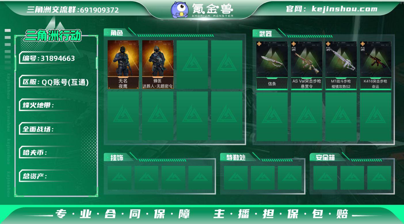 阿伟3867 资产500M 满特勤 红皮夜鹰送葬人水墨差一抽,刀皮信条,枪皮极品S棱镜紫色M7,优C悬赏令,优B命运K416,AW子弹172发,仓库大红多,非洲之心4颗