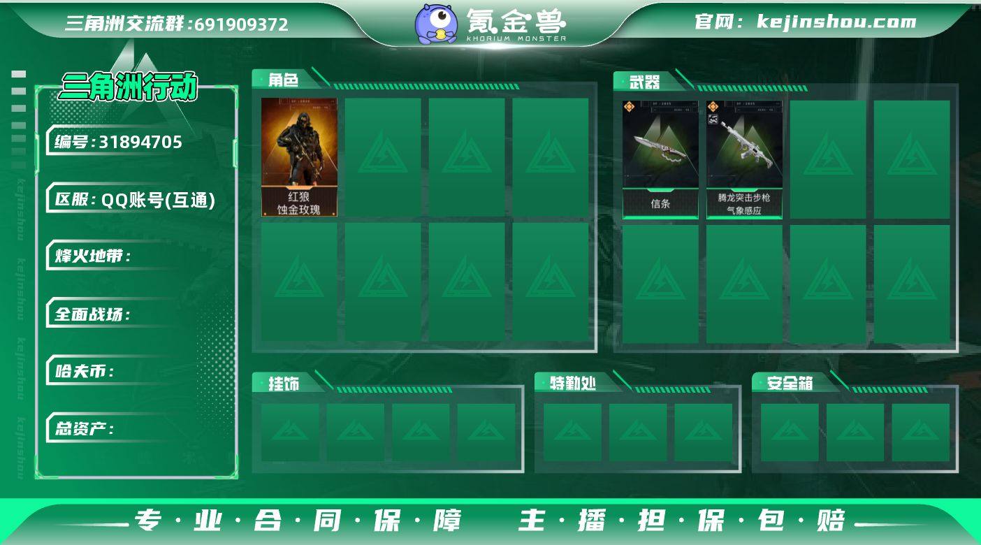 【热门皮肤搭配组合:四刀皮+双红皮+单典藏枪皮】【中额资产214M+饰金玫瑰+黑天际线+北极星+怜悯+暗星+处刑者】【Q区三端互通】【无二次】YXz8091-特勤处:仓库8级/靶场6级/训练中心6级-总资产214.8m-哈夫币6118w-烽火等级:60级 【干员外观】:红狼-蚀金玫瑰,露娜-黑·天际线,威龙-壮志凌云,蜂医-送葬人·无题密令,无名-夜鹰,深蓝-不破誓约,红狼-电锯惊魂,露娜-金牌射手 【近战皮肤】:近战-暗星,近战-北极星,近战-怜悯,近战-黑鹰,近战-处刑者 【典藏外观】:M7战斗步枪-棱镜攻势S2 【典藏外观成色】:M7战斗步枪-棱镜攻势S2(优品C) 【传说外观】:M4A1突击步枪-蚀金玫瑰,M4A1突击步枪-阿米娅,SG552突击步枪-运动员,AK-12突击步枪-夜鹰,AK-12突击步枪-特斯拉线圈,SCAR-H战斗步枪-铁艺苍穹,SCAR-H战斗步枪-水墨云图,SCAR-H战斗步枪-启航,G3战斗步枪-骑士,CAR-15突击步枪-阿米娅,腾龙突击步枪-捞点薯条,K437突击步枪-北极星,KC17突击步枪-电锯惊魂,MK47突击步枪-暗星,UZI冲锋枪-特斯拉线圈,SMG-45冲锋枪-骑士,SR-3M紧凑突击步枪-特斯拉线圈,SR-3M紧凑突击步枪-暗星,勇士冲锋枪-能天使-午夜邮差,QCQ171冲锋枪-北极星,725双管霰弹枪-送葬人-无题密令,M250通用机枪-骑士之心,M14射手步枪-蛮荒,AWM狙击步枪-捞点薯条,93R-捞点薯条,复合弓-黑·天际线 【史诗外观】:Vector冲锋枪-潜袭者,ASh-12战斗步枪-碎冰行动,M4A1突击步枪-特勤执行,AKM突击步枪-林中猎手,QBZ95-1突击步枪-曙光,QBZ95-1突击步枪-ACE,ASh-12战斗步枪-守夜人,ASh-12战斗步枪-无极限,M16A4突击步枪-竞赛选手,AUG突击步枪-蝮蛇,AUG突击步枪-特勤执行,M7战斗步枪-百步穿杨,SG552突击步枪-尖端治疗,SG552突击步枪-深海恐惧,SCAR-H战斗步枪-囚徒,G3战斗步枪-战场英杰,G3战斗步枪-流沙送葬,PTR-32突击步...