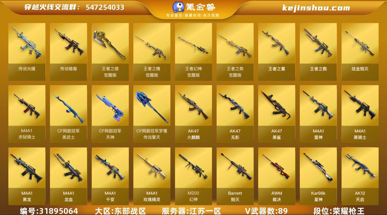 江苏一区-91V-6王者-3炫金 【传说武器】:传说光耀,传说暗裔 【热门武器】:传说光耀,传说暗裔,QBZ03-金色蔷薇,Scar Light-白虎,HK417-朱雀*2,M200-幻神,死亡之眼*2,Kar98K-星神,M4A1-黑骑士*2,汤姆逊-烈龙*7,RPK-盘龙*5,加特林-炼狱*3,斯泰尔-蝴蝶,羊驼玩偶,USP-雷暴,沙鹰-修罗*2 【王者炫金武器】:王者之戮,王者之翼,炫金毁灭*3 【音效卡】:AK47-火麒麟音效卡,M4A1-黑骑士音效卡,Barrett-毁灭音效卡,绝迹语音包,Kar98K-星神音效卡 【皮肤】:M200-幻神-黄忠皮肤,幻神-星耀 皮肤,幻神-荣耀世冠EP 皮肤,雷神-荣耀之魄,雷神-虎将,雷神-耀金皮肤,雷神-传奇N9,AK47-火麒麟-传奇EVEN,火麒麟-轻羽皮肤,火麒麟-战神关羽,毁灭-荣耀之怒,毁灭-英雄计划 皮肤,M4A1-黑龙-361,黑骑士-暗月,黑骑士耀金皮肤,黑骑士-战神马超,无影-霓裳皮肤,战神-紫绶金章皮肤,战神-流金岁月皮肤,天龙-能量核心,修罗-星空*3,修罗-冠军之魂,屠龙-星耀 皮肤 【角色】:战地猎狐,王者-瞳-闭月羞花,王者-魅影,暗夜-X,风暴女,嘉年华灵狐,娟娟,灵狐者-X,曼陀罗-X,潘多拉-X,潘多拉-甜心教官,青霞仙子,蛇姬,蜀雪,雪莉杨,樱-缤纷夏日,影武者-X,职业选手 【人偶武器】:斯泰尔-蝴蝶,AWM-灵狐-15周年嘉年华 【暴走生化】:死亡之眼*2,超级对讲机 【挑战大师】:神圣爆裂者III,AK47-冰龙粉碎者 【英雄级武器】:M4A1-千变,AK47-火麒麟*2,M4A1-黑龙,M4A1-雷神*3,M4A1-黑骑士*2,AK47-无影,AK12-天启,AK47-黑鲨,M4A1-龙血*3,HK417-朱雀*2,Scar Light-白虎,M4A1-玫瑰精灵,QBZ03-金色蔷薇,王者之魄-觉醒版,王者之势-觉醒版,AK-47-猩红传说*3,黑武士-CF网剧冠军,Barrett-毁灭*2,AWM-裁决,M200-幻神,Kar98K-星神,王者幻神-觉醒版,RPK-盘龙*5,加特林-炼狱*3,汤姆逊-烈龙*...