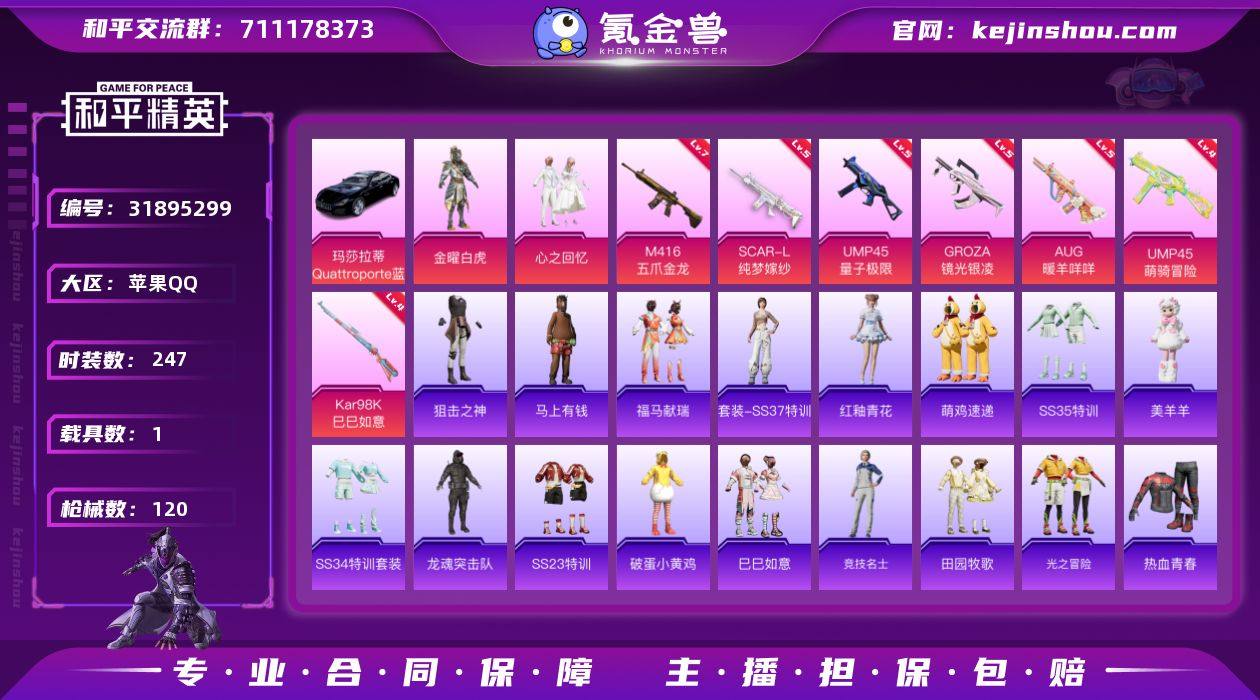 实名:可二次实名 是否支持人脸包赔:支持 粉装数量:2 特效枪数量:7 载具数:1 时装数:247 枪械数:120 金曜白虎,心之回忆 七级M416-五爪金龙,五级AUG-暖羊咩咩,五级GROZA-镜光银凌,五级SCAR-L-纯梦嫁纱,五级UMP45-量子极限,四级UMP45-萌骑冒险,四级Kar98K-巳巳如意 玛莎拉蒂Quattroporte(夜幕蓝) 狙击之神,马上有钱,福马献瑞,红釉青花,SS37特训,雨过天青,萌鸡速递,SS35特训,美羊羊,SS34特训套装,冰川特警,缤纷果语,冰河战士,白色伏地魔,白熊同盟,春光漫游,雏菊兔兔,长空猛禽,纯真浪花,蝶变,电音精灵,粉红小猪,疯狂小兔子,光之冒险,幻彩翩翩,怀庆长公主,竞技名士,快闪甜心,龙的传人,拉斐尔,龙魂突击队,萝兰蝴蝶,Mark.06,妙红点点,米开朗基罗,魅力单车,曼妙人鱼,破蛋小黄鸡,破晓战魂,轻风白浪,青涩时光,热情海星,热血青春,热血骑手,森林游猎者,SS14特训,SS19特训,SS20特训,SS22特训,SS23特训,SS26特训,SS27特训,SS28特训,SS29特训,SS31特训套装,巳巳如意,特殊使命,田园牧歌,香桃花海,星途旅人,耀粉歌者,鹰眼刺客,鱼渊荷华,燕燕于飞 初号机 觉醒Ver.降落伞,纯梦嫁纱降落伞,脆鲨七海降落伞,千金淑猫降落伞,青空秋雨降落伞,忍者神龟降落伞