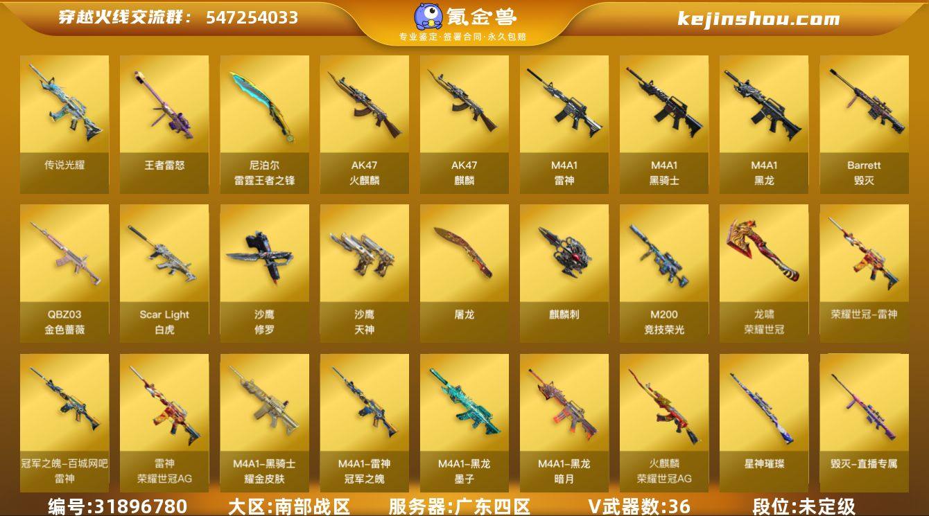 广东四区-36V-14王者-1炫金 【传说武器】:传说光耀(序列号版) 【热门武器】:传说光耀,QBZ03-金色蔷薇,Scar Light-白虎,M4A1-青龙,M200-竞技荣光,荣耀世冠-雷神,荣耀世冠-柯尔特,Kar98K-星神,牛牛-AK47,M4A1-黑骑士,沙鹰-修罗,荣耀世冠-龙啸 【王者炫金武器】:王者雷怒,雷霆王者之锋,炫金骑士 【音效卡】:AK47-火麒麟音效卡,M4A1-雷神音效卡*2,M4A1-黑龙音效卡,Scar Light-白虎音效卡 【皮肤】:白虎-电玩粉兔皮肤,金色蔷薇-枪娘阿敏 皮肤,星神-璀璨皮肤,雷神-冠军之魄,雷神-荣耀世冠AG,火麒麟-荣耀世冠AG,毁灭-直播专属,黑龙-暗月,黑龙-墨子皮肤,黑骑士耀金皮肤,麒麟刺-斗鱼平台皮肤 【角色】:王者-魅影,乔伊教练,修道士,云海玲珑,暗夜-X,初恋灵狐,芳心审判者,风暴女,嘉年华灵狐,灵狐者-X,龙儿-小淘气,潘多拉-X,潘多拉-甜心教官,青霞仙子,幽,游珑儿,海豹突击队 【人偶武器】:AWM-灵狐-15周年嘉年华,COP-旗袍,牛牛-AK47,迷你裂空之翼,深渊终结者手雷,迷你超能女侍 【挑战大师】:冰龙粉碎者-白马银枪,激光毁灭者III-白马银枪*2,阐释者III 【英雄级武器】:AK47-火麒麟,AK47-麒麟,M4A1-黑龙,M4A1-雷神,M4A1-黑骑士,M4A1-青龙,Scar Light-白虎,QBZ03-金色蔷薇,王者之势-觉醒版,王者火魄-觉醒版,王者之烈-觉醒版,M4A1-雷霆王者-觉醒版,QBZ-03-王者蔷薇-觉醒版,荣耀世冠-雷神,Barrett-毁灭,Kar98K-星神,M200-竞技荣光,Barrett-雷霆王者-觉醒版,沙鹰-修罗,沙鹰-天神*3,COP 357-雷霆王者-觉醒版*2,荣耀世冠-柯尔特,屠龙*2,麒麟刺,荣耀世冠-龙啸,高爆手雷-竞技荣光*4,闪光弹-竞技荣光*3,闪光弹-雷霆王者-觉醒版*2,烟雾弹-竞技荣光*5,烟雾弹-雷霆王者-觉醒版 【道具】:BS战队炫彩背包,亚洲杯纪念炫彩背包,冰冰企鹅背包,战舰背...