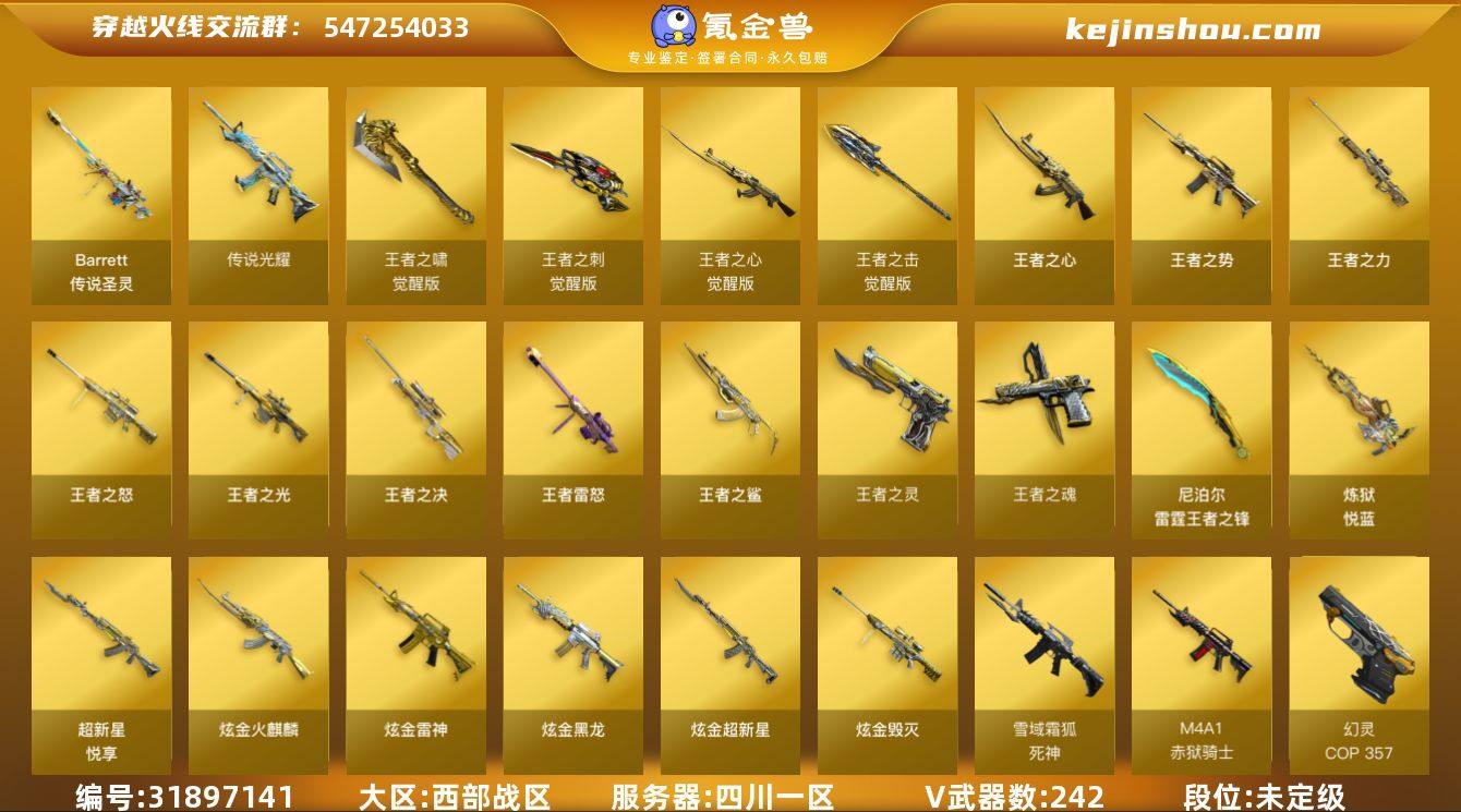 四川一区-266V-44王者武器数-9炫金武器数 【传说武器】:传说光耀,传说圣灵 【热门武器】:传说光耀,传说圣灵,QBZ03-金色蔷薇*2,Scar Light-白虎,HK417-朱雀,M200-幻神,死亡之眼*5,荣耀世冠-火麒麟,荣耀世冠-雷神,荣耀世冠-柯尔特,M4A1-黑骑士*7,汤姆逊-烈龙*8,RPK-盘龙*6,加特林-炼狱*7,斯泰尔-蝴蝶,降世魔童,雷神-小红,火麒麟-绝迹,USP-雷暴,COP-堕天神*2,COP 357-幻灵*2,沙鹰-修罗*8,炽芒蝶刃*2,金刚伞 【王者炫金武器】:王者之鲨*2,超新星-悦享,王者之势,王者之心*2,王者之决*2,王者之光*2,王者之怒*2,王者之力,王者雷怒,炼狱-悦蓝,王者之灵*2,王者之魂,雷霆王者之锋,炫金火麒麟,炫金骑士,炫金黑龙,炫金雷神*2,炫金武士,炫金超新星,炫金毁灭*2,王者之魄高爆手雷,王者之魄闪光弹 【音效卡】:M200-幻神音效卡,AK47-火麒麟音效卡,M4A1-雷神音效卡,M4A1-黑龙音效卡,M4A1-黑骑士音效卡,Barrett-毁灭音效卡,Barrett-极光音效卡,麒麟刺-百战金芒-盛典舞曲音效卡,炼狱-百战金芒-庆典舞曲音效卡,死神-雪域霜狐-怀旧音效卡 【皮肤】:M200-幻神-黄忠皮肤,幻神-周瑜皮肤,幻神-冠军之幻,幻神-AG-CFPLS17冠军,幻神-宠儿-2021MVP,白虎-大汉风骨,白虎-电玩粉兔皮肤,QBZ03-荣耀世冠白鲨,雷神-暗月,雷神-能量核心*2,雷神-荣耀之魄,雷神-星空*2,M4A1-雷神-CFS 2019,雷神-耀金皮肤,雷神-冠军之魄,雷神-宠儿-2019MVP,雷神-R.LGD-CFPLS18冠军,雷神-维纳斯皮肤,M4A1-再燃火线,火麒麟-冠军之心,火麒麟-华夏之心,火麒麟-战神关羽,传奇石头-横秒之巅,火麒麟-平天大圣,火麒麟-大唐荣光,毁灭-荣耀之怒,毁灭耀金皮肤*2,毁灭-星空,毁灭-冠军之怒,毁灭-CFS2020,毁灭-BEAN-2020MVP,黑龙-能量核心*6,M4A1-黑龙-361,黑龙-冠军之武,