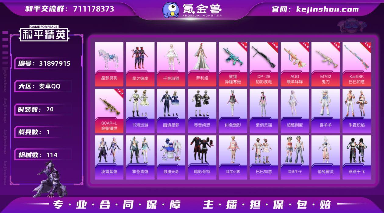 安卓手Q H-OWM0227【3粉装14特效枪1载具4粉色飞行器 浪漫天命/红眼罩/星之彼岸/千金淑猫/萨利娅/绒宝小鹅/奈斯/魂电/罗莉/幸运青/X/阿虎/马上有钱/俏兔智灵/风玲/海琴烟/喜羊羊/绯色魅影/曹焱兵】36535热力值-5王牌印记-70套装-114枪皮 【热门品类】:套装-浪漫天命,套装-暗影哥特 【粉色套装】:粉装-星之彼岸,角色-千金淑猫,角色-萨利娅 【粉色枪皮等级】:SCAR-L-金蛇镇世(三级),AUG-暖羊咩咩(五级),M762-鬼刀(五级),蜜獾-异瞳寒姬(五级),ACE32
